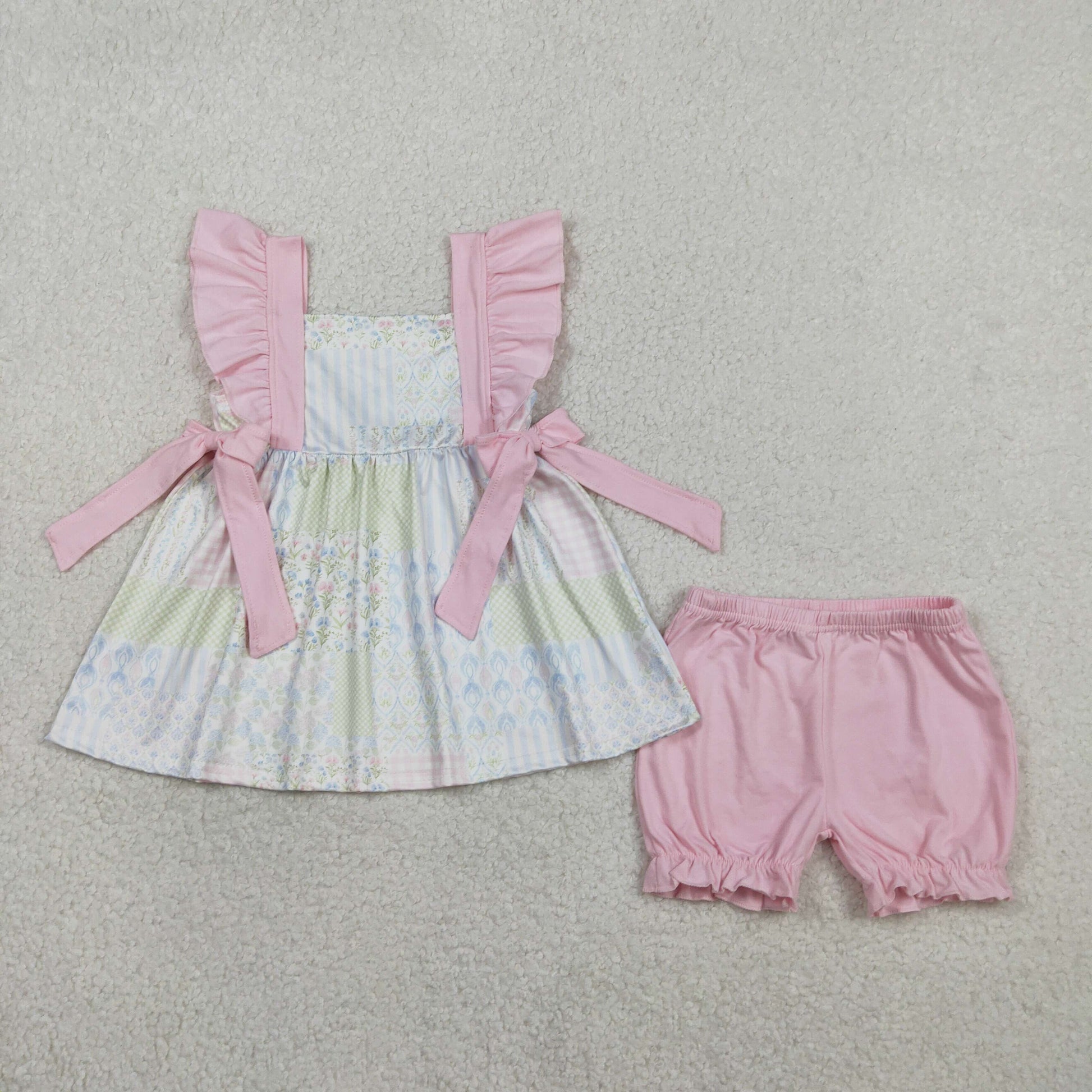 2.4 RTS NO MOQ (In stock)GSSO2951 Baby Girls Bows Flowers Checked Tunic Ruffle Shorts Clothes Sets