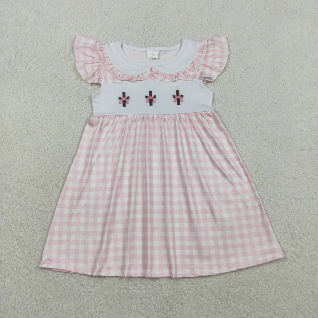 2.4 RTS Sibling Baby Kids Embroidery Crosses Easter Checked Collar Knee Length Dress Rompers