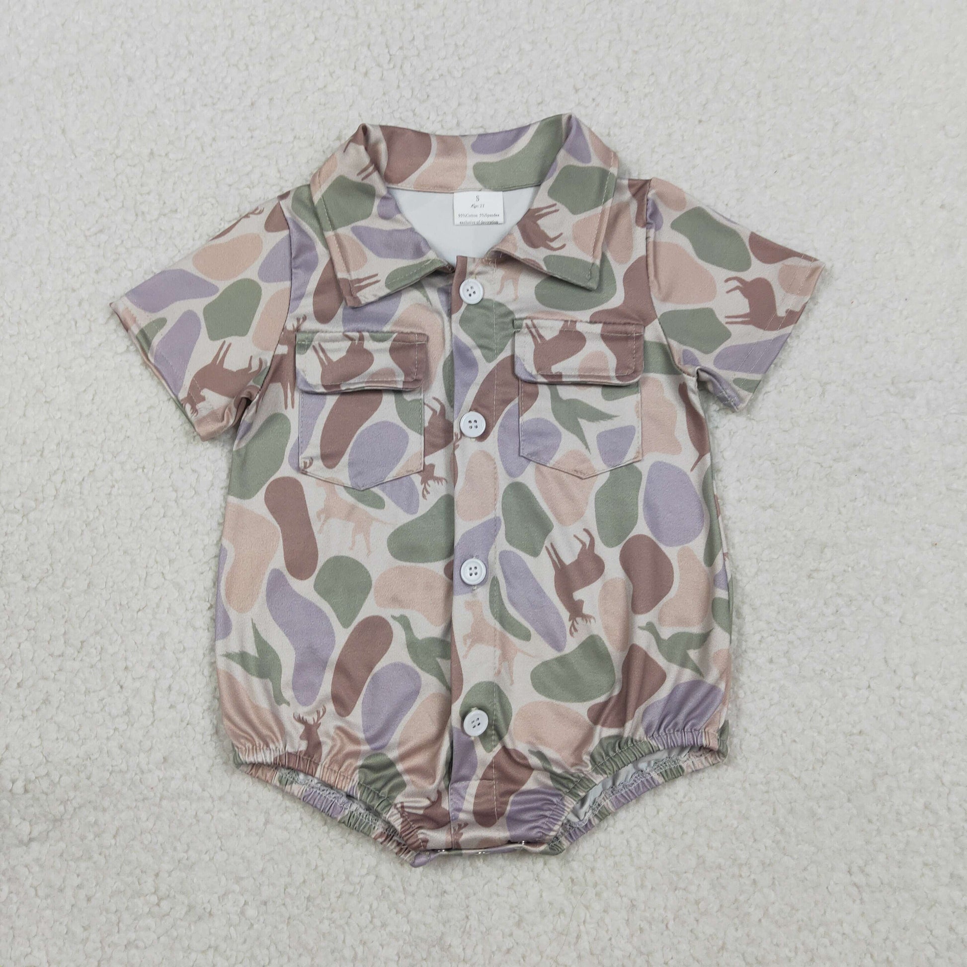 2.7 RTS NO MOQ (In stock)SR3544 Baby Boys Ducks Dogs Deer Camo Pockets Button Hunting Rompers