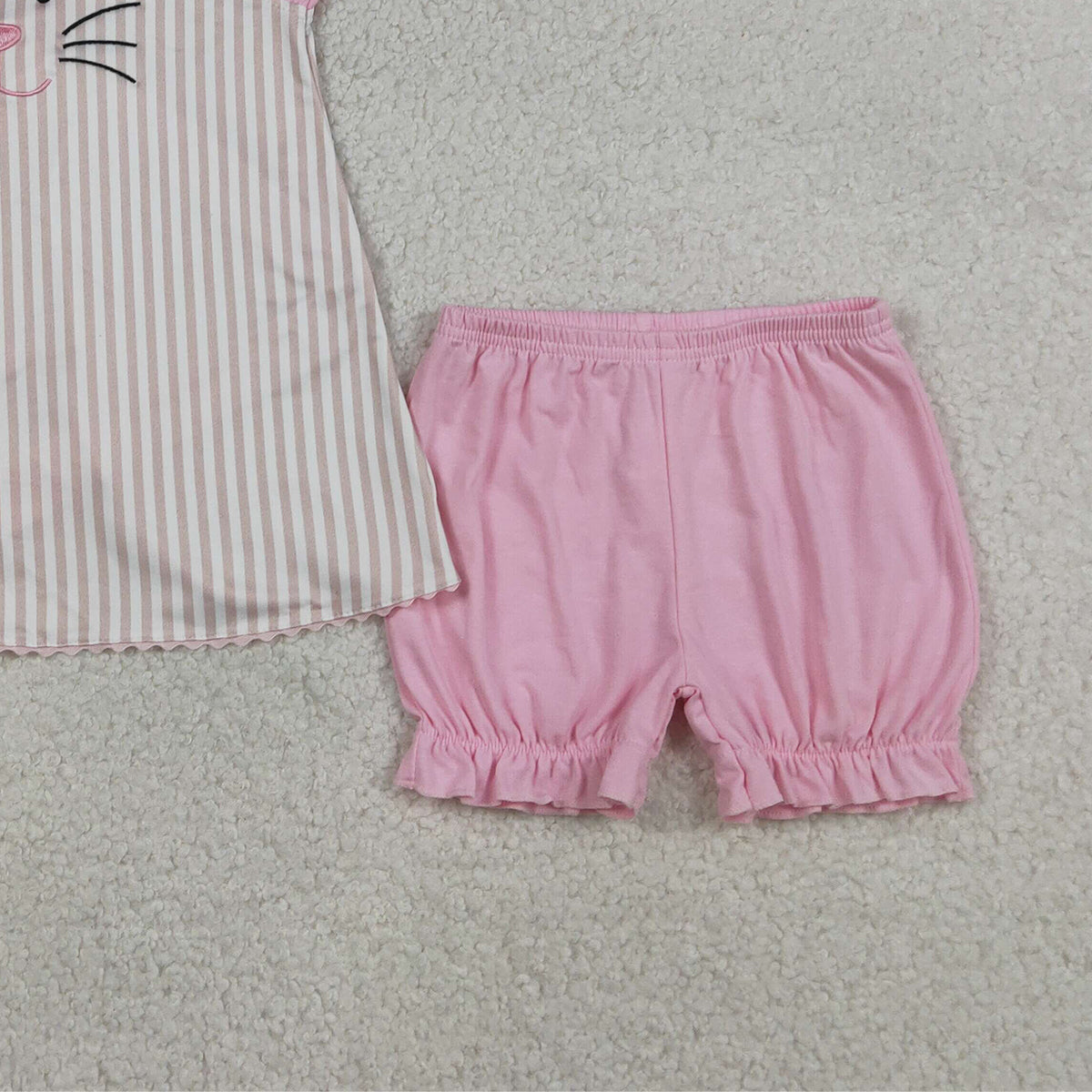 3.27 RTS NO MOQ (In stock)GSSO2924 Kids Clothing for Baby Girls Sleeveless Embroidery Rabbits Back Bows Stripe Tunic Ruffle Shorts Easter Sets