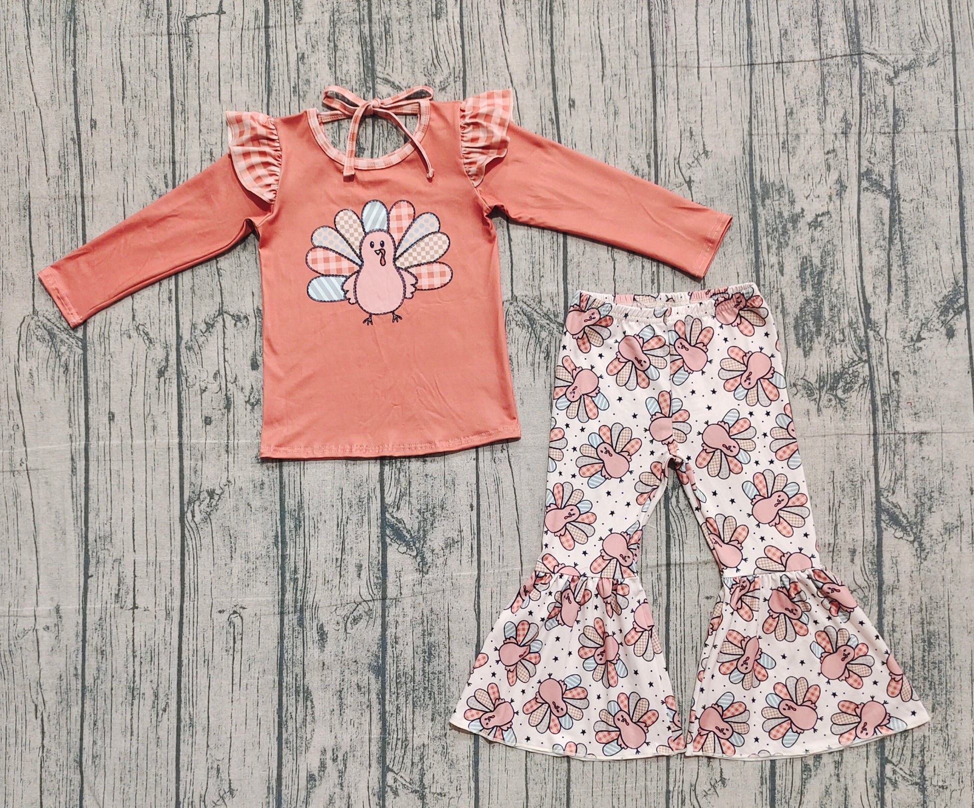 9.24 GLP2605 Sample No Moq Baby Girls Thanksgiving Turkey Bows Top Bell Bottom Pant Set