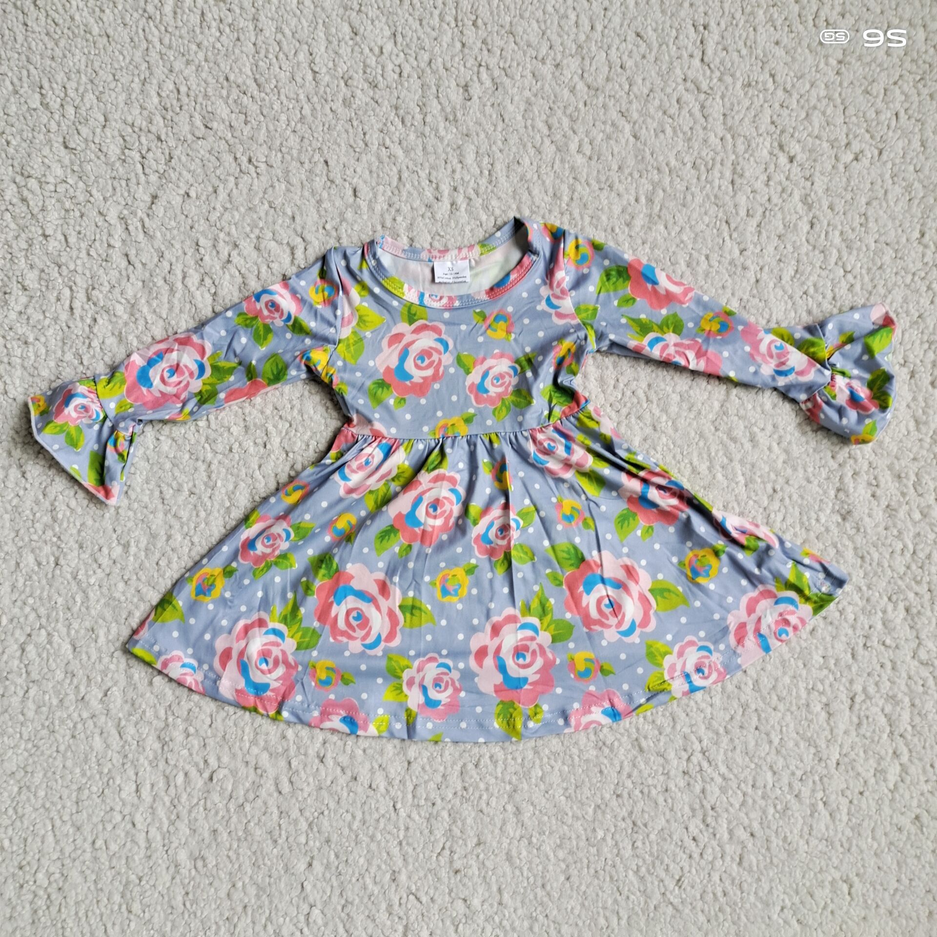 9.24 RTS NO MOQ(In stock)G2-24-6..; Baby Girls Winter Dress Gray long-sleeved dress with pink flowers, green leaves and white dots