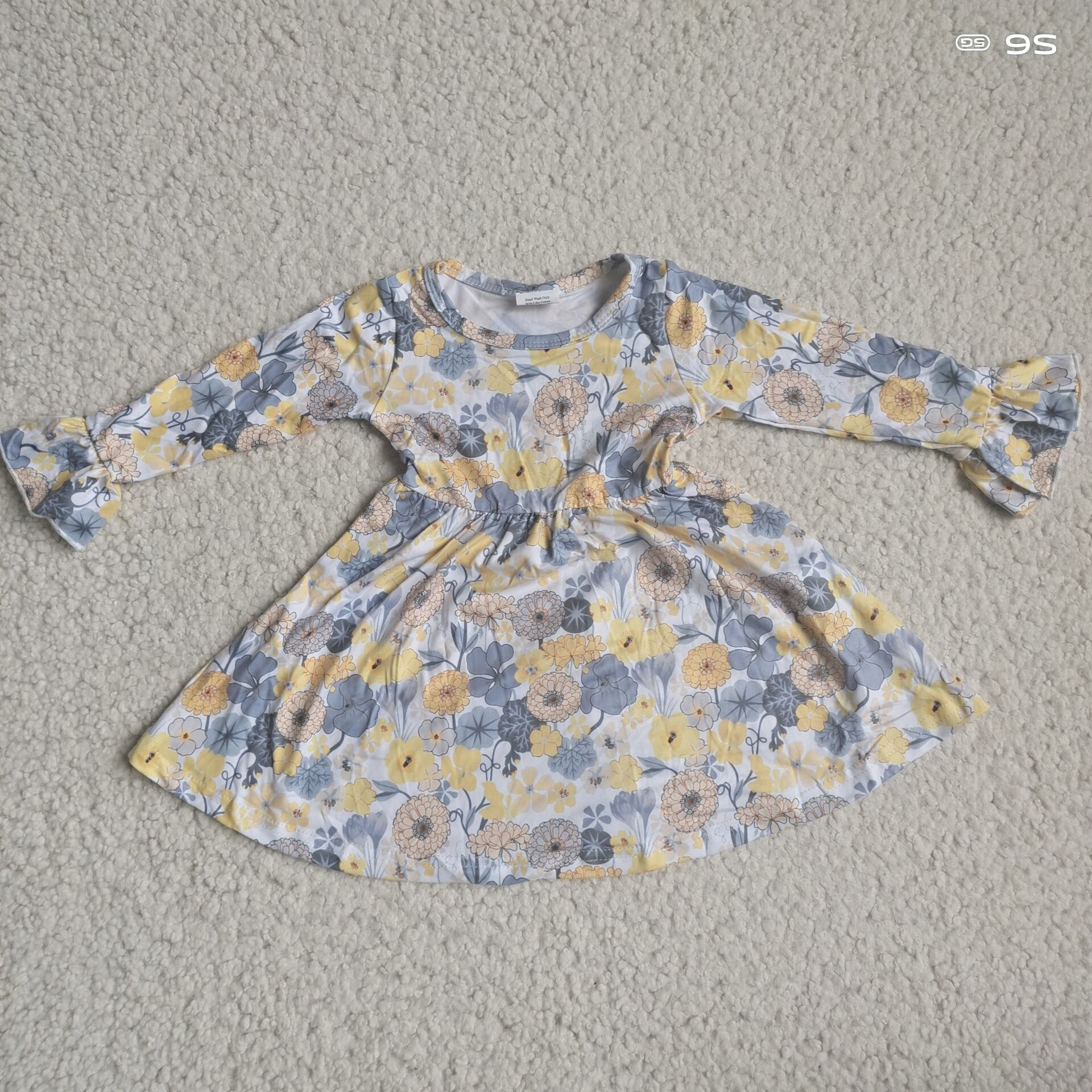 9.25 RTS NO MOQ(In stock)G4-12-8 Baby Girls Winter Dress Dark gray-yellow chrysanthemum long-sleeved dress