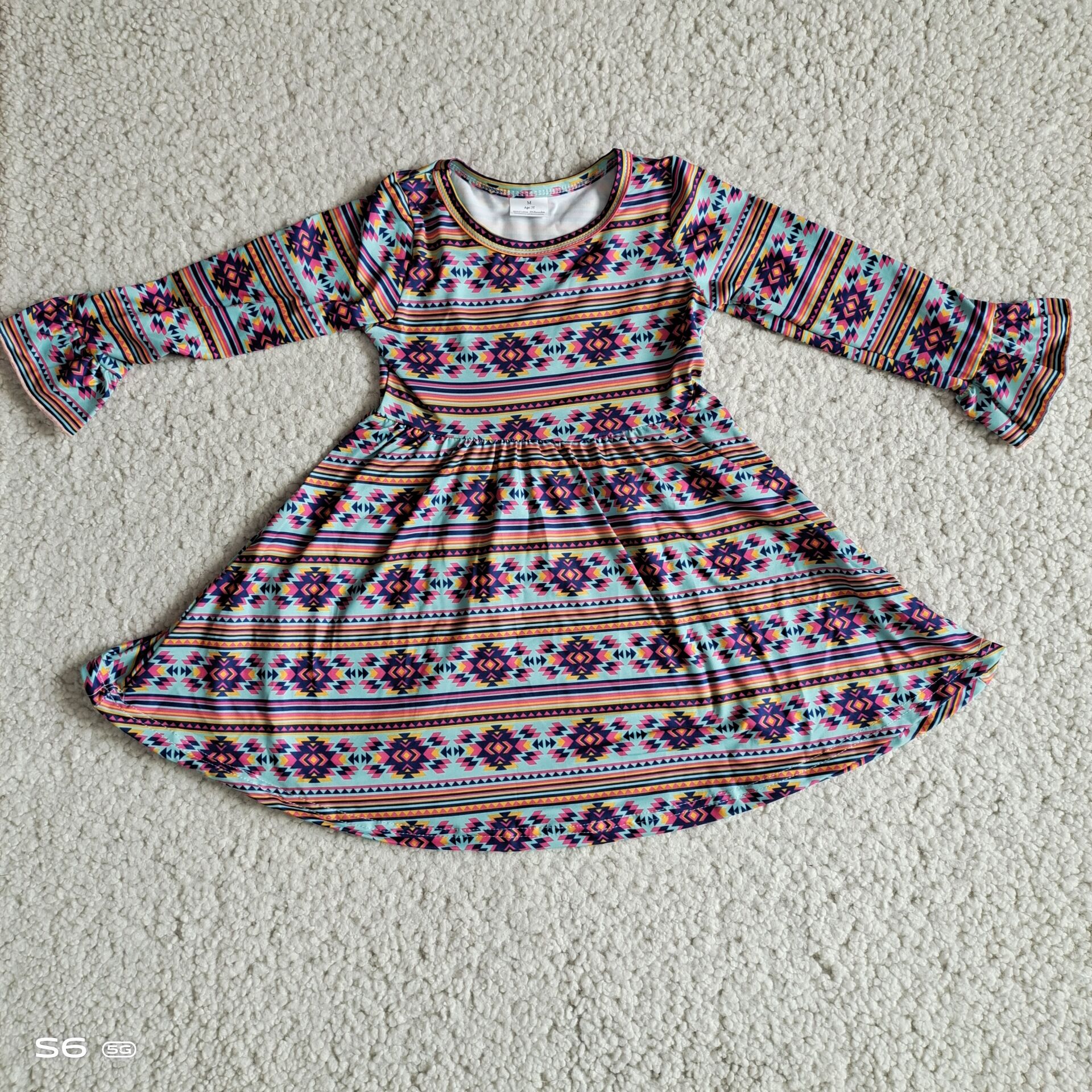 9.27 RTS NO MOQ(In stock)G3-12-5/;, Baby Girls Winter Dress Green long-sleeved dress with blue and pink diamond stripes