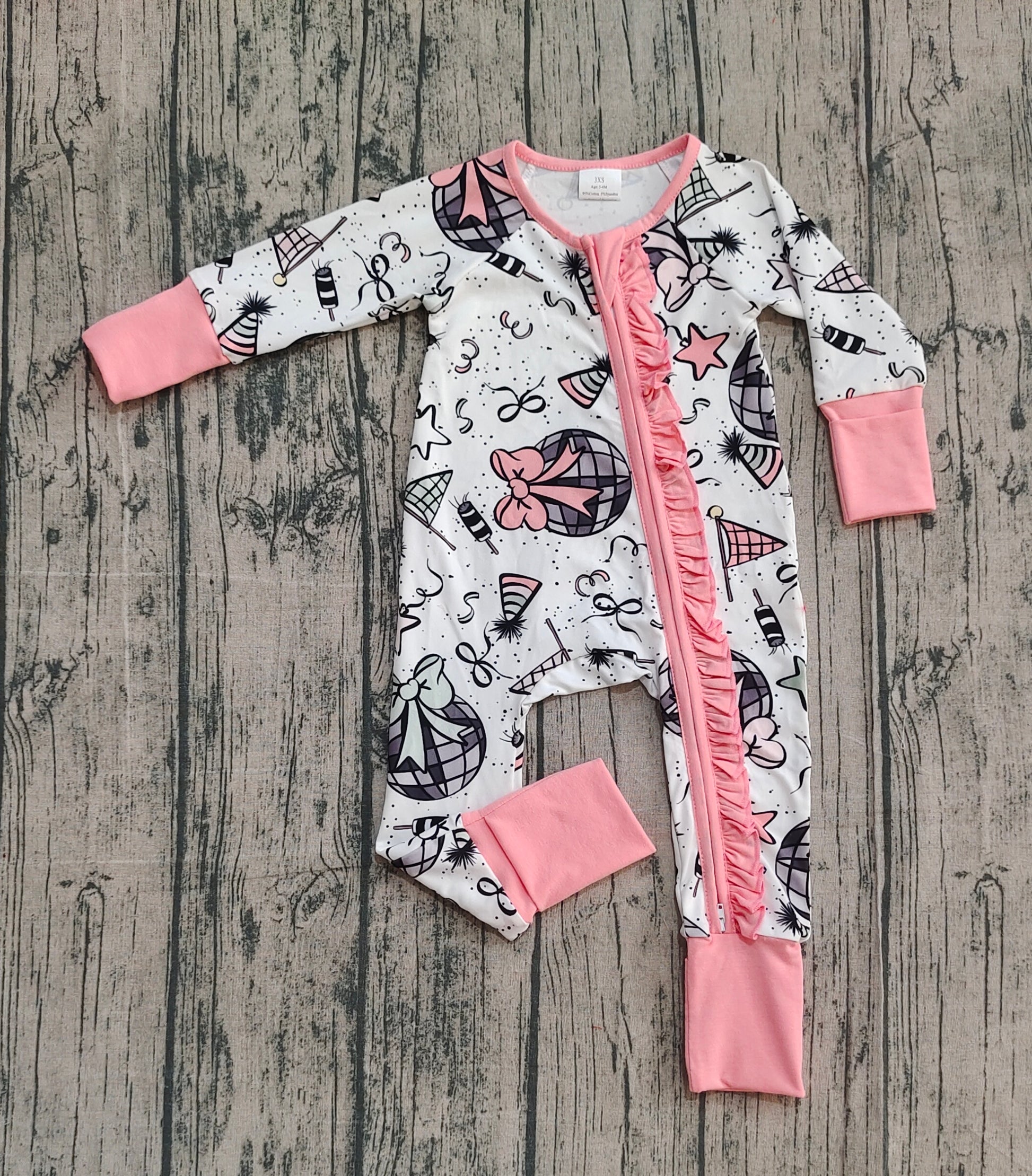 9.29 LR2571 Sample No Moq Baby Girls Happy New Year Ruffle Zipper Footie Rompers
