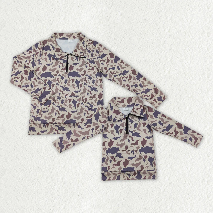 Adults women and Baby Girls Khaki Camouflage Zipper Stand Collar Pullover Long Sleeve Top