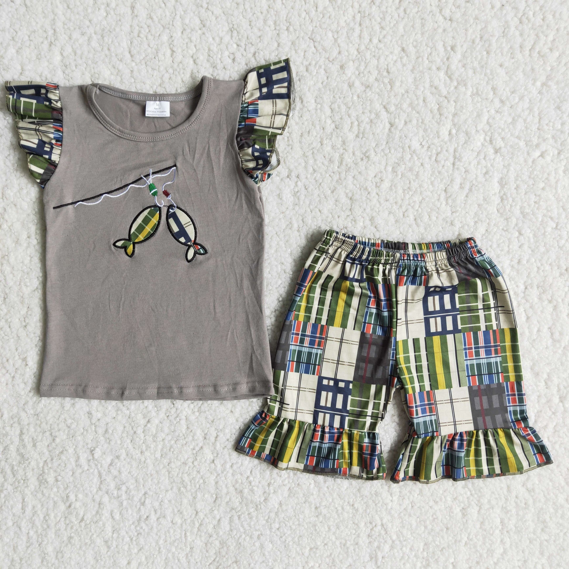 5.15 B3-15Fishing embroidery cotton shirt ruffle shorts girls clothing