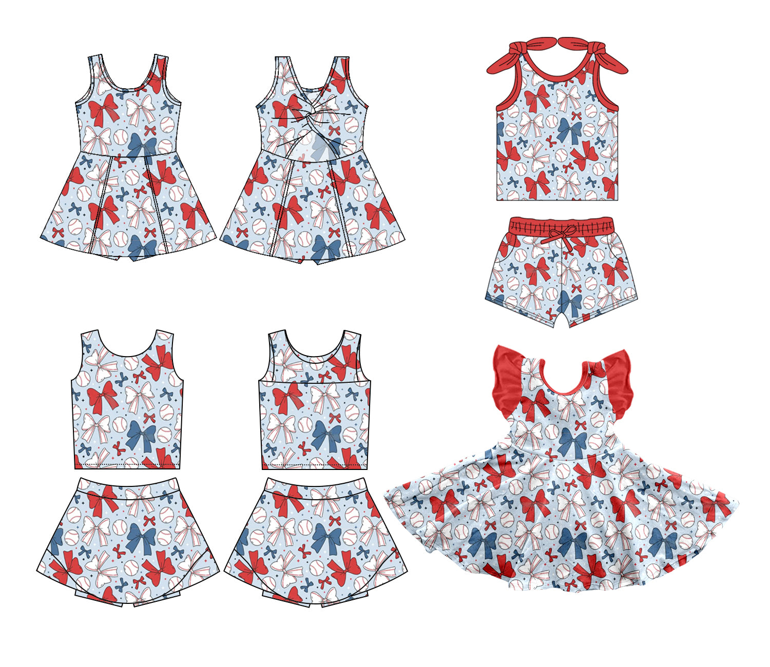 Kids Girls Sleeveless Baseball Set with Red Blue Bow Active Wear Outfit