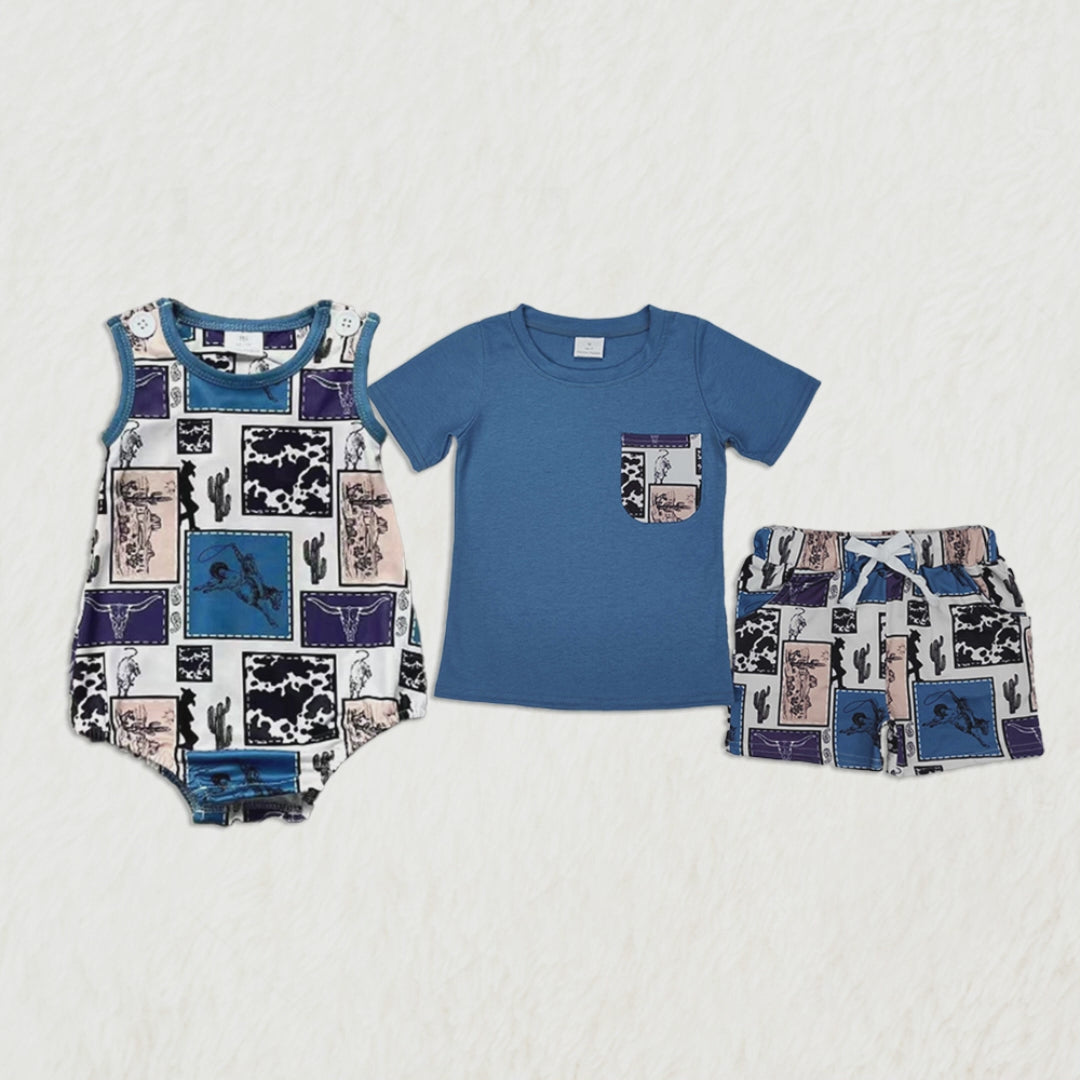 6.05 Western Boys Rodeo Cactus Short Sleeve Pocket Top Matching Shorts Set Casual Country Style Children's Clothing