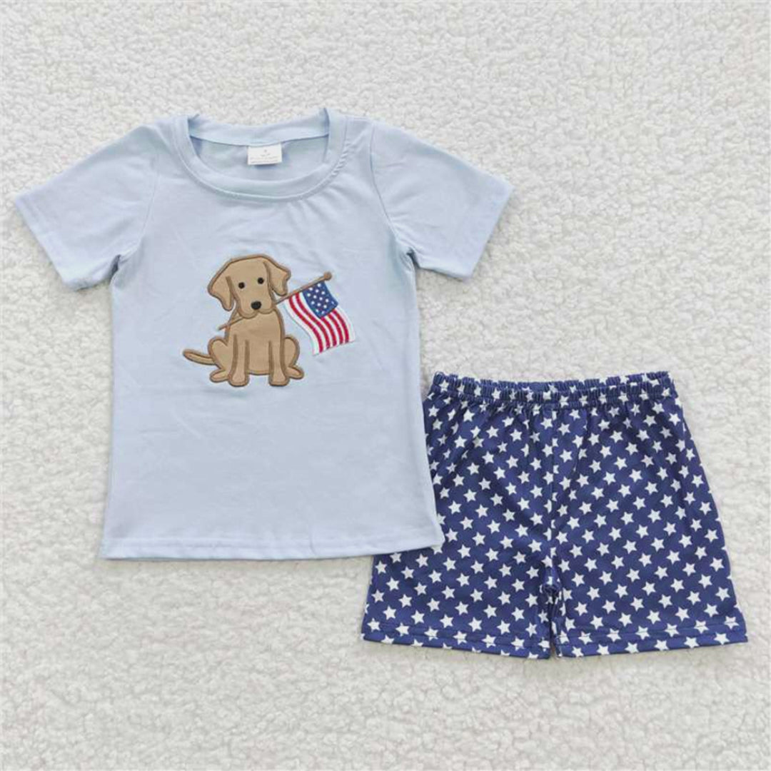 BSSO0227Boy's 4th of July Outfit Dog Flag Embroidery Shirt with Stars Shorts Patriotic US Independence Day Children's Clothing