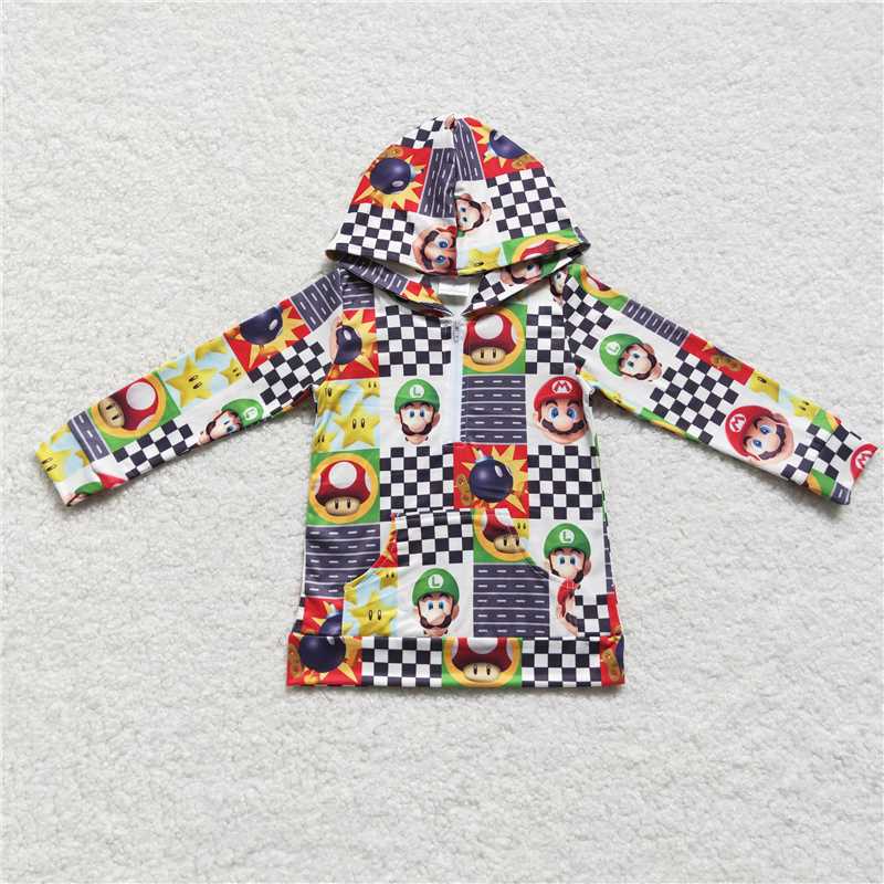 BT0311 Cartoon Mario black and white plaid zipper hooded long-sleeved top