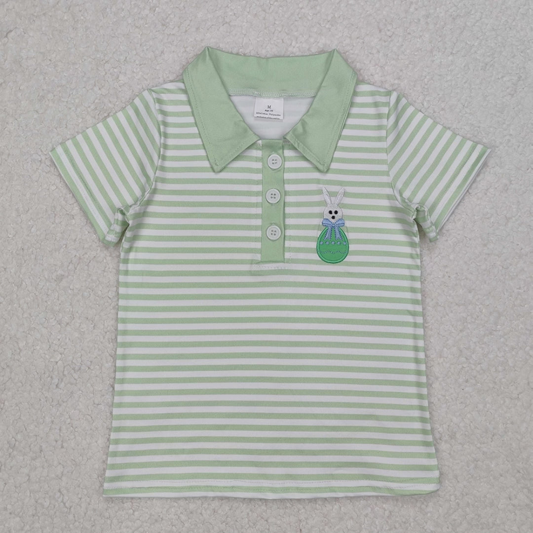 BT1046Kids Boys Easter Polo Shirt Short Sleeves Green Stripe Bunny Design Casual Fashionable Top for Children