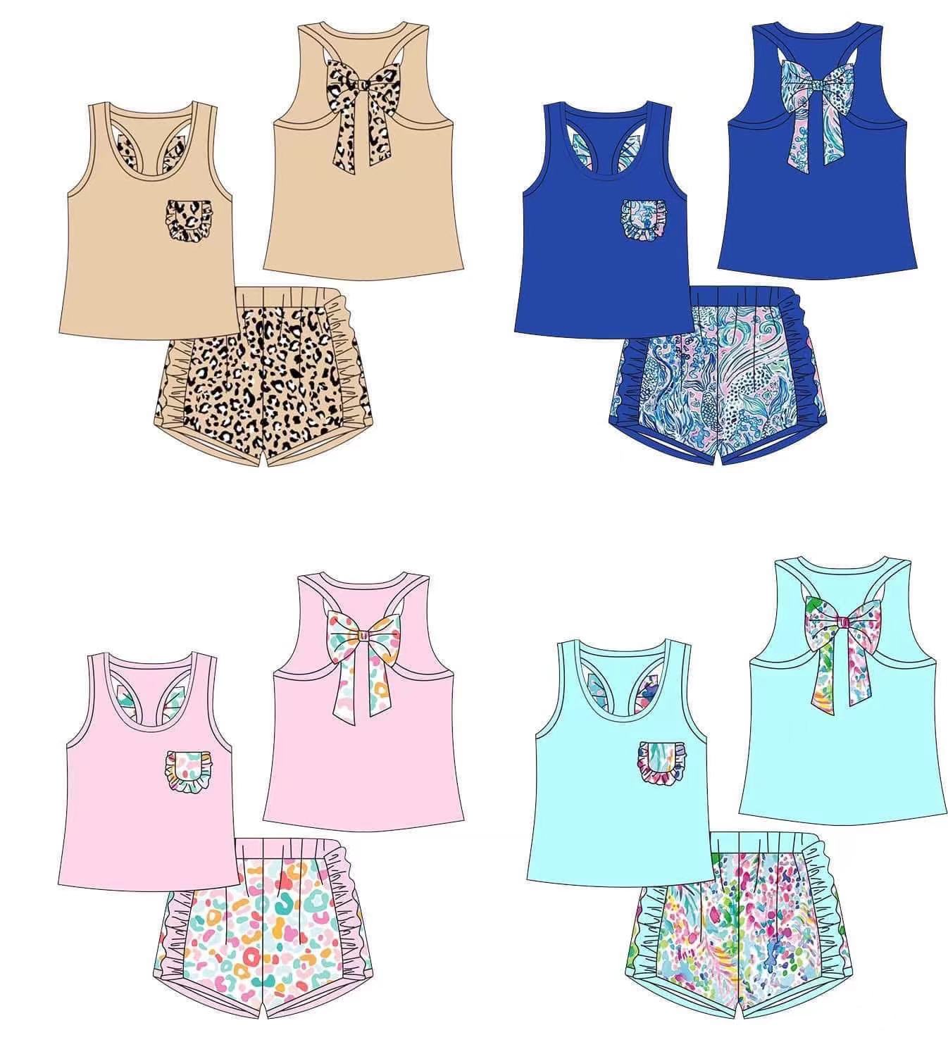 Sleeveless blue watercolor fish bow ruffle shorts girls clothes