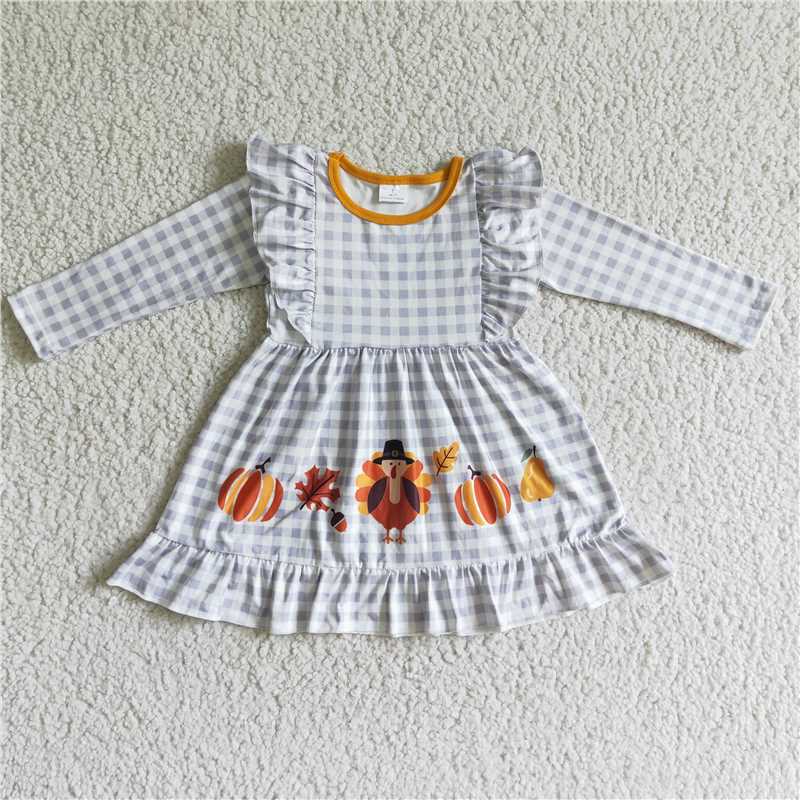 GLD0056 Girls Thanksgiving Turkey Pumpkin Plaid Long Sleeve Dress