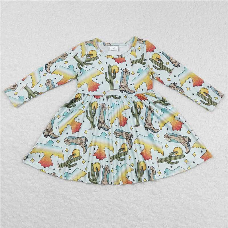 GLD0349 Baby Girls Western Birds Boots Cactus Knee Length Dresses