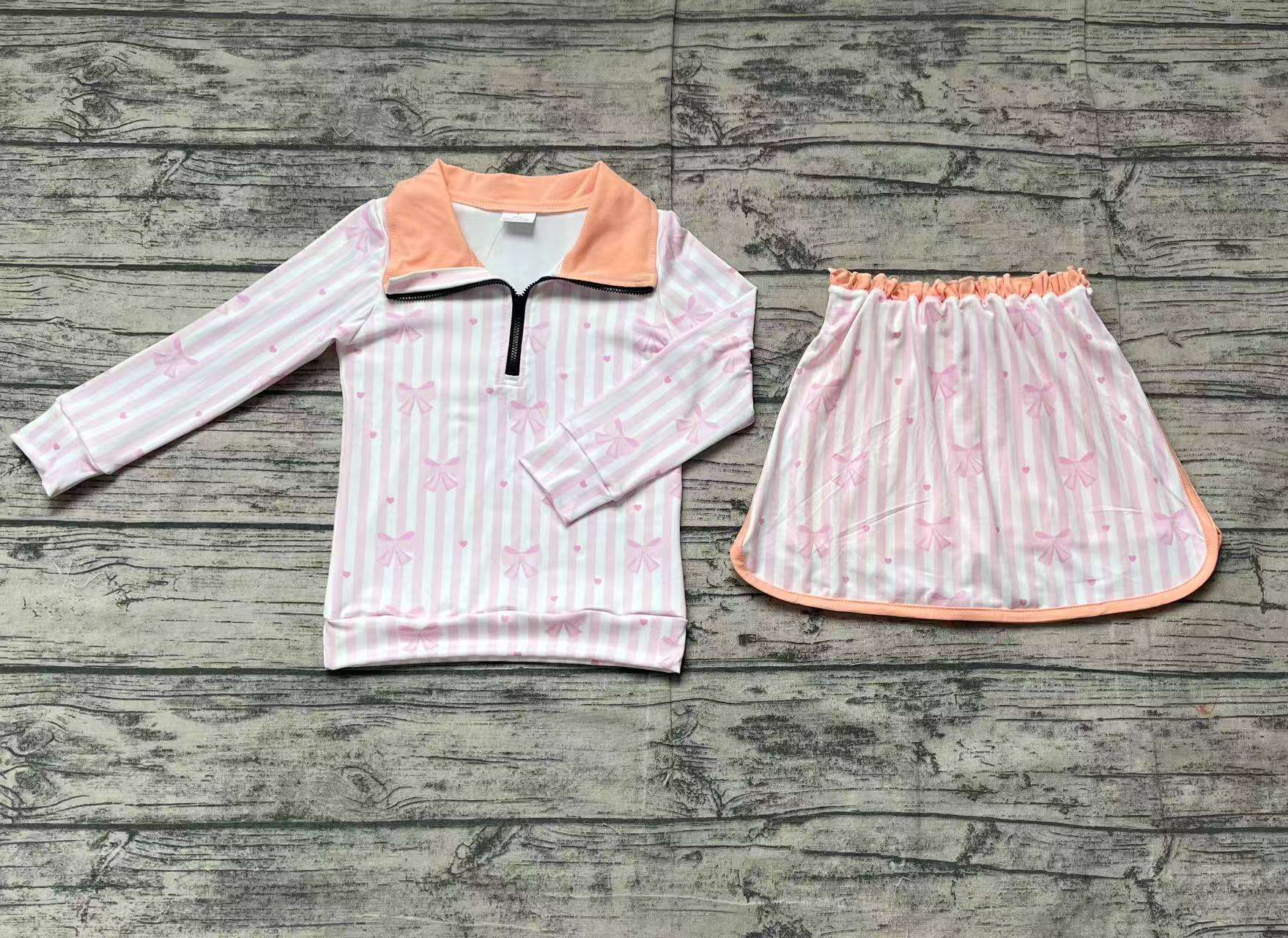 GLD1004Baby Girls Pink Long Sleeves Bows Stripe Zipper Pullover Ruffle Skirts Valentines Set