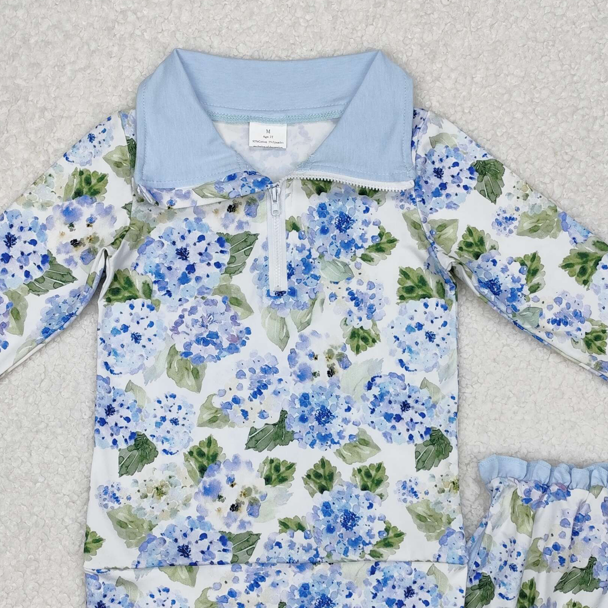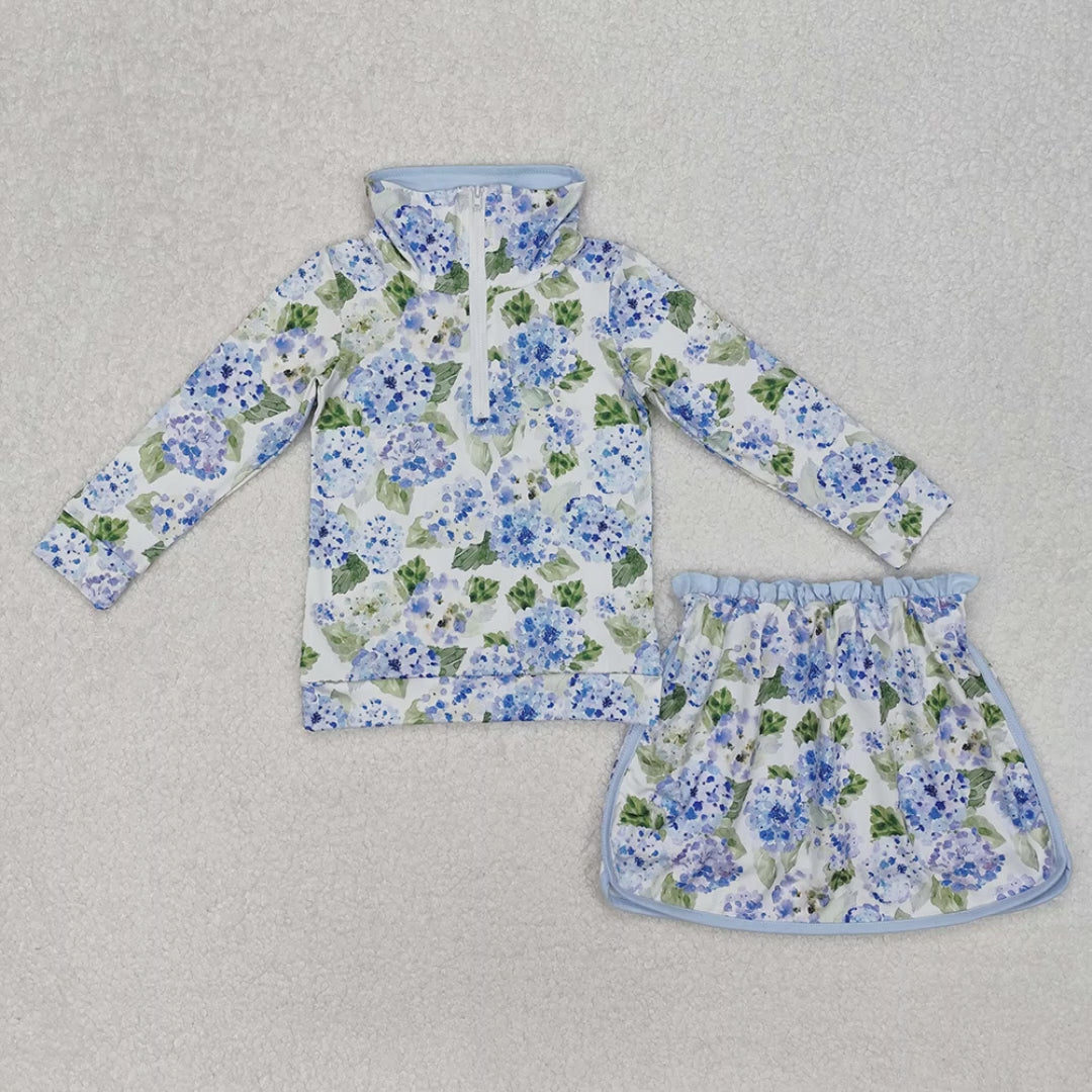 GLD1016Kids Girls Light Blue Floral Long Sleeve Top Skirt Set Cute Floral Print Outfit for Children