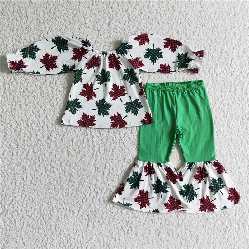 GLP0160 Girls Christmas red and green maple leaf long sleeve and trousers suit