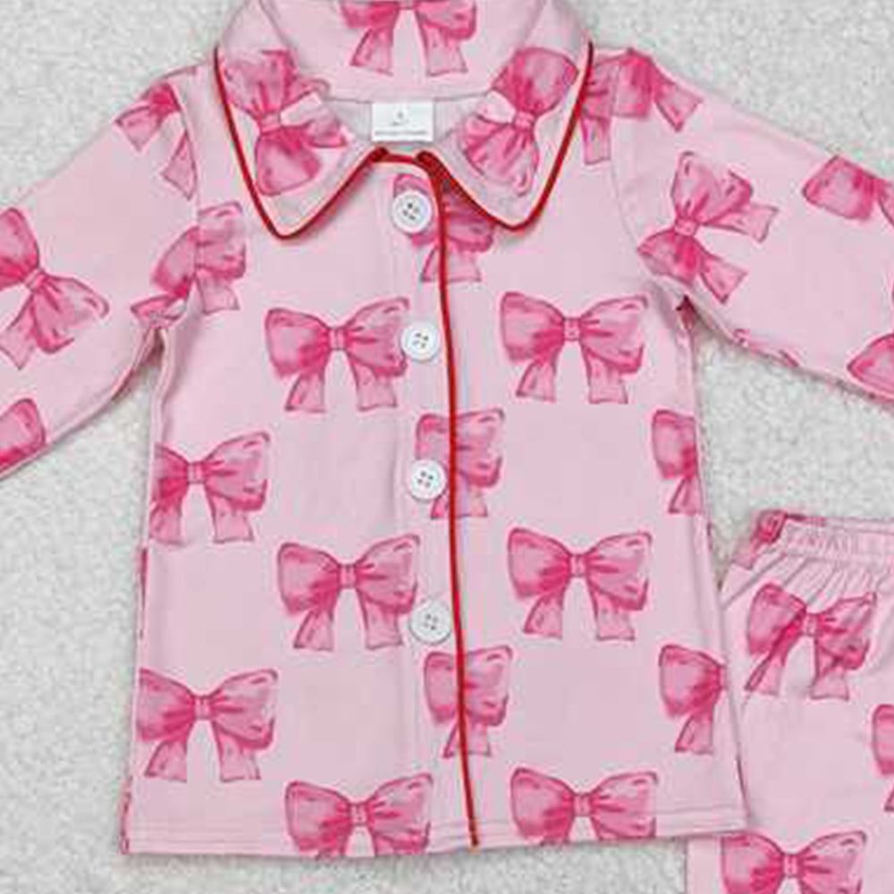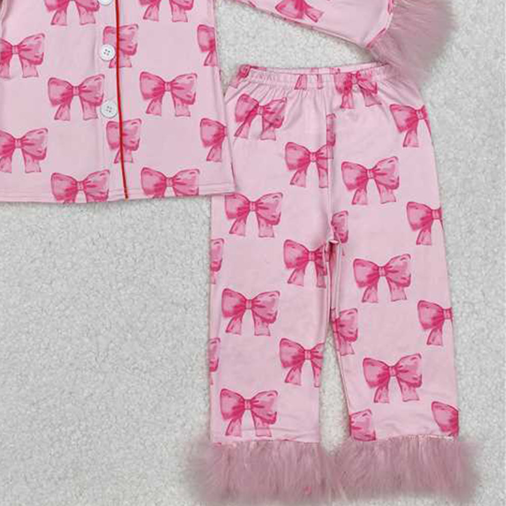 4.30 GLP2289 RTS NO MOQ Pink bow fur long sleeves kids girls button down pajamas