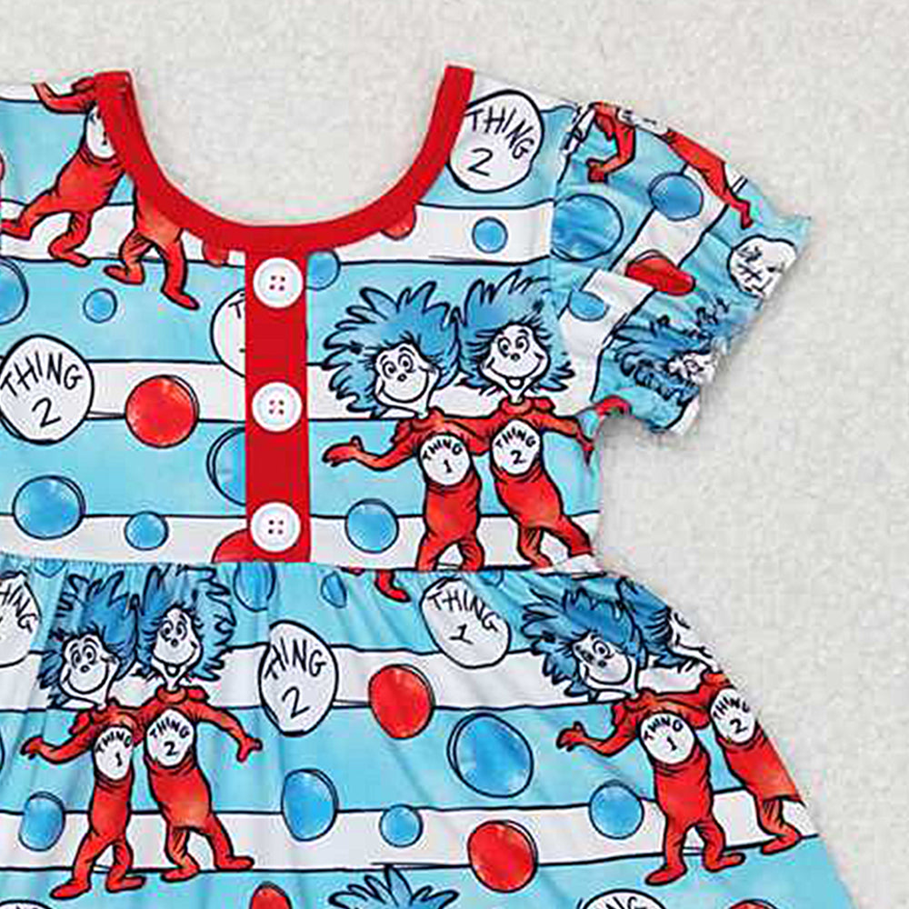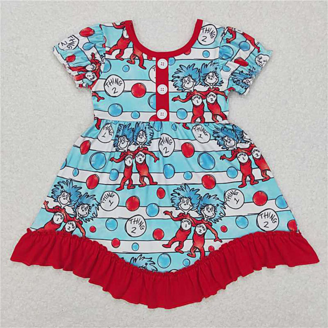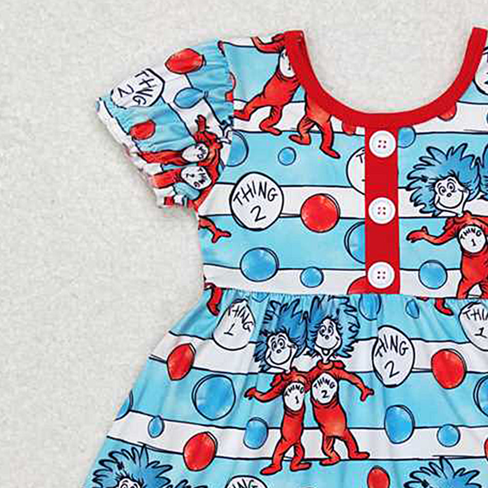GSD0557Blue Stripe Cat Hat Ruffle Girls Dress Short Sleeves Cute Animal Print Feminine Fashionable Skirt for Little Girls