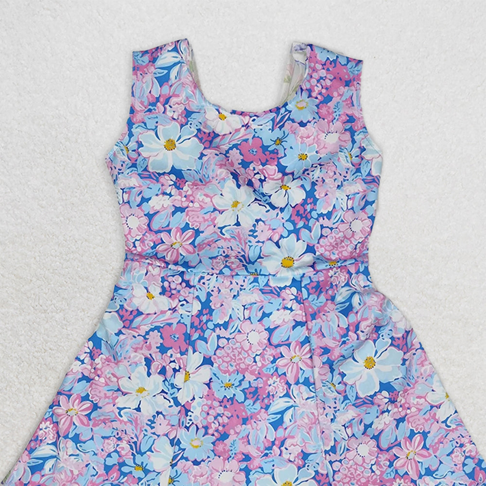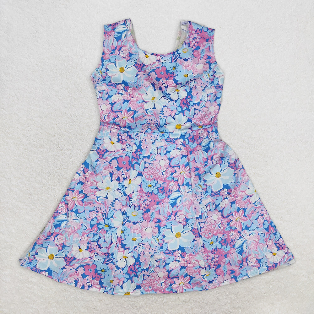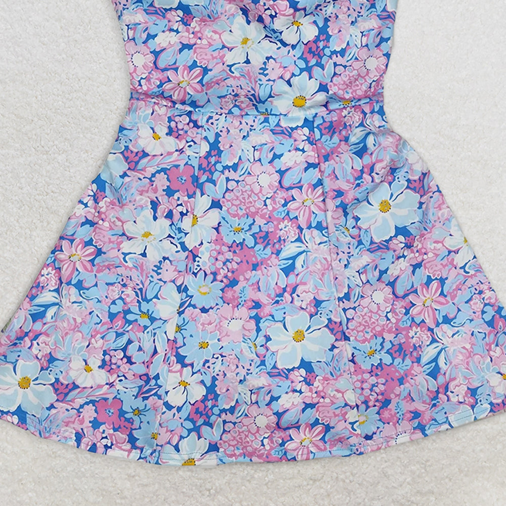 GSD1845RTS NO MOQ Baby Girls Summer Yoga Dress Blue Pink Floral Sleeveless Baby Girls Athletic Dresses Children's Sportswear Comfortable Lightweight Girls' Outfits