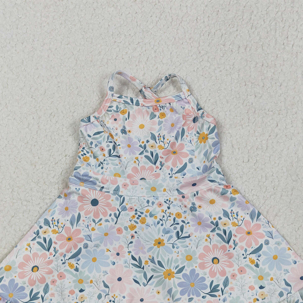 6.18 GSD2281RTS NO MOQ Baby Girls Summer Yoga Dress Baby Girls Aqua Strap Floral Yoga Ruffle Knee Length Dresses