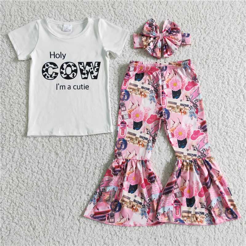 GSPO0033 cow white short-sleeved pink flared pants suit