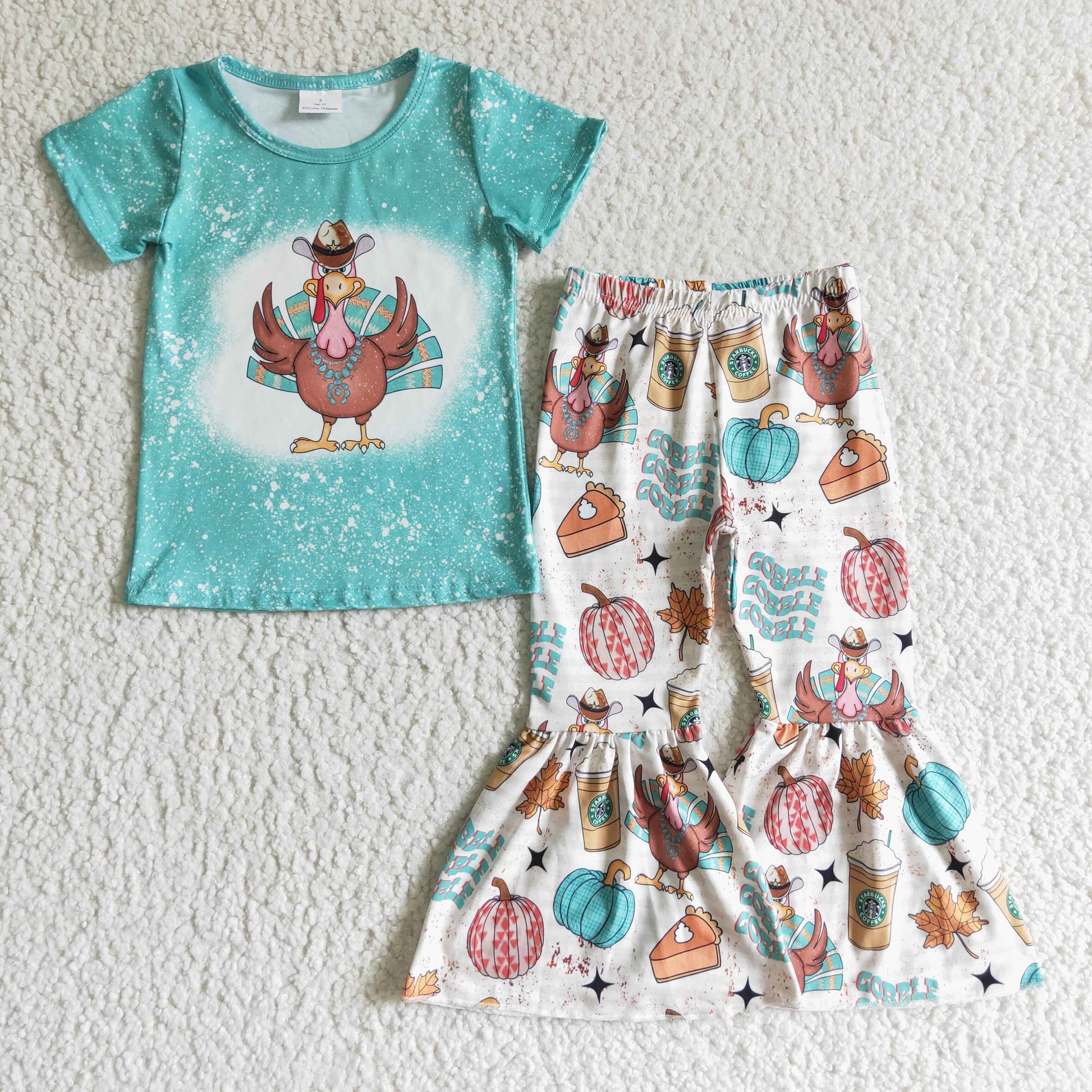GSPO0195 baby girls thanksgiving blue turkey bell bottom pants sets
