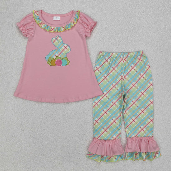 GSPO0974Girls Pink Floral Rabbit Tunic Ruffle Pants Outfit Easter Themed Children's Clothing Set