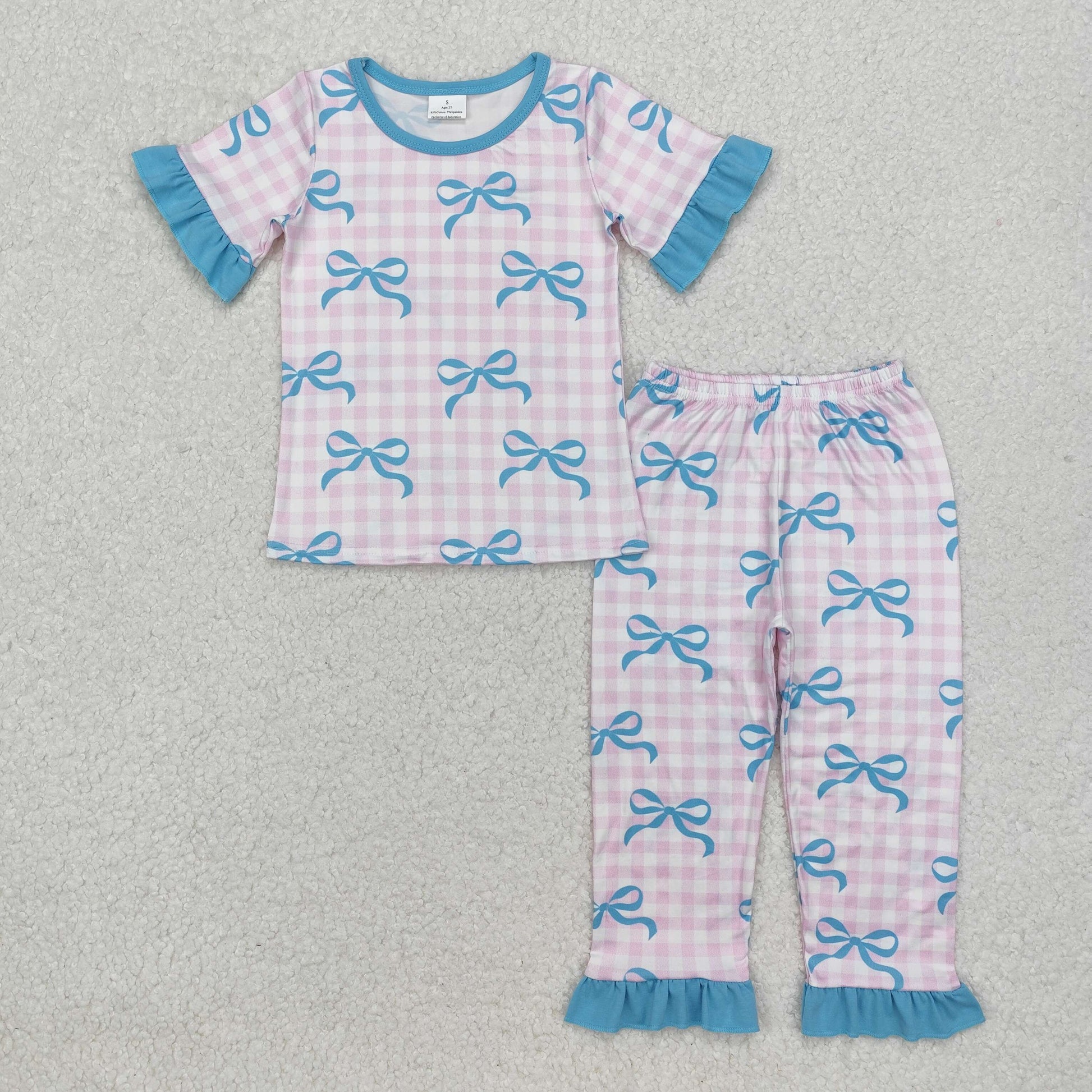 GSPO1736Short sleeves pink plaid bow baby girls pajamas