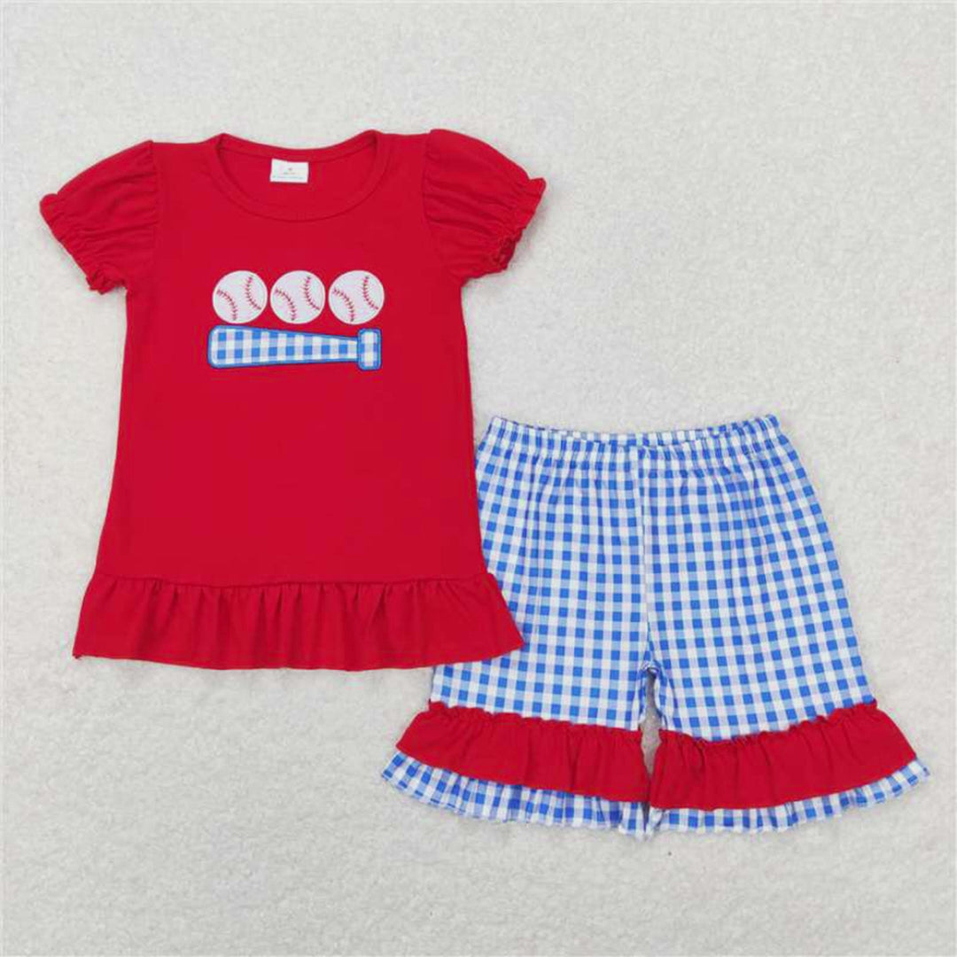 GSSO0428Girls Plaid Shorts Set Short Sleeves Red Baseball Top Outfit for Kids