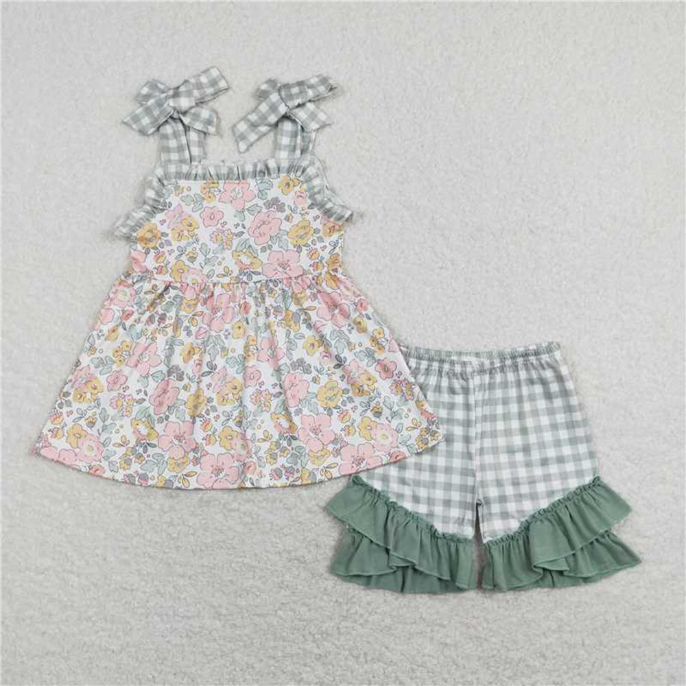 GSSO0565Girls Plaid Suspender Tunic with Floral Ruffle Shorts Set Cute Preemie to 14T Size Matching Family Outfit Option