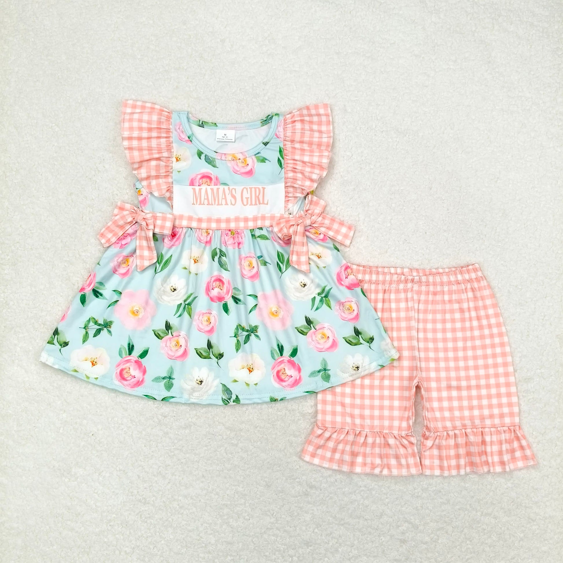 GSSO0803 mama's girl letter flower orange plaid lace bow flying sleeve shorts suit