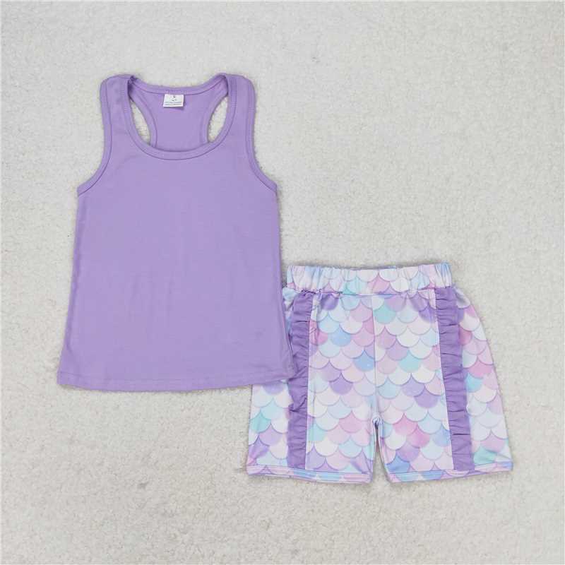 GSSO1060 Mermaid scale bow solid color sleeveless blue and purple lace shorts set