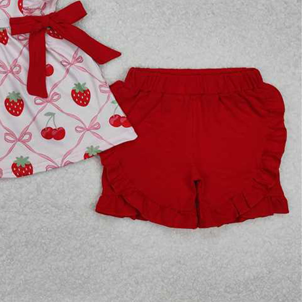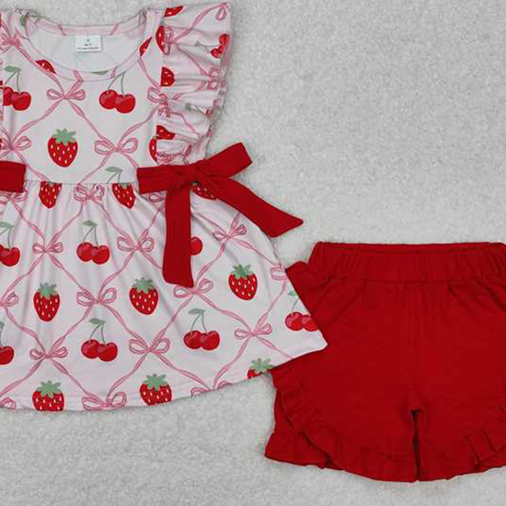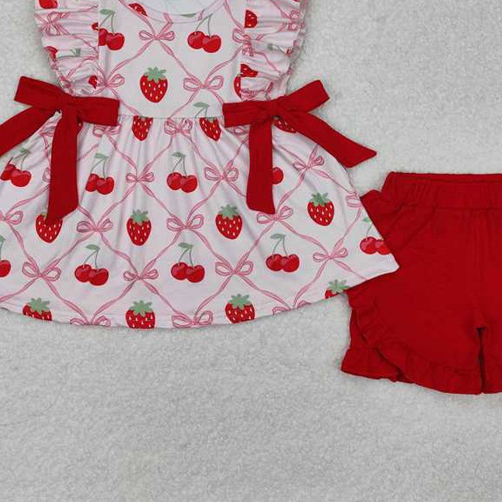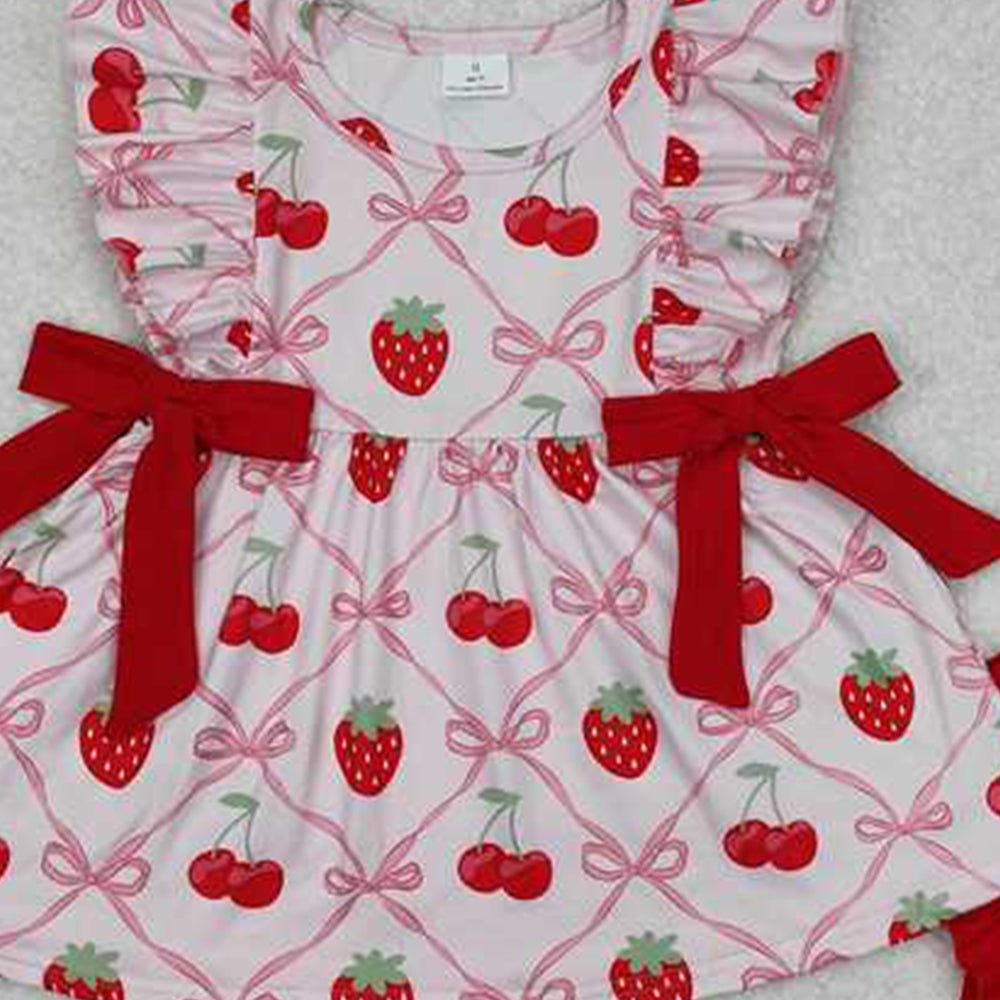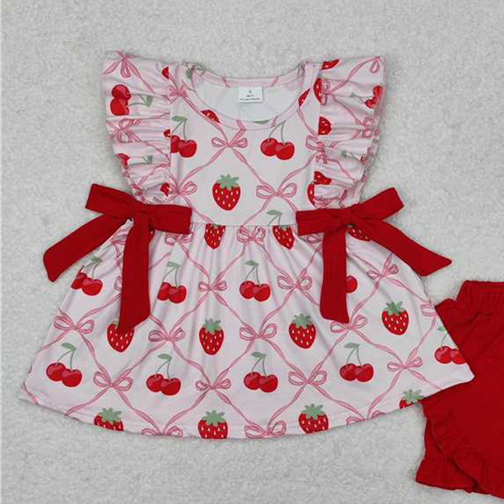4.30 GSSO1640 RTS NO MOQ Baby Girls Pink Flutter Sleeves Bows Strawberry Print Tunic Ruffle Shorts Set