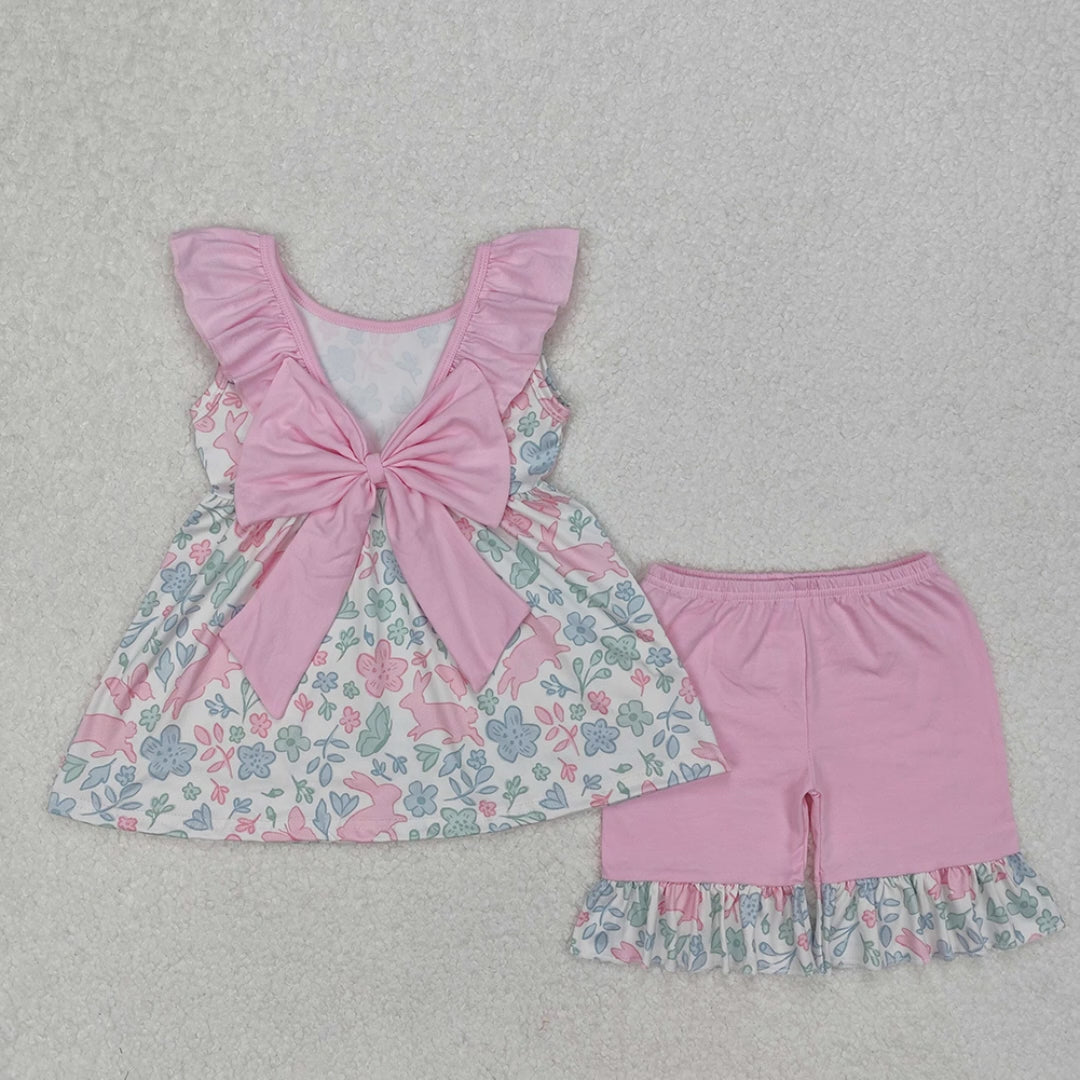 GSSO1881Girls Pink Ruffle Floral Bunny Tunic Short Set Easter Outfit Spring Clothing Toddler Kids Animal Print Headband Included