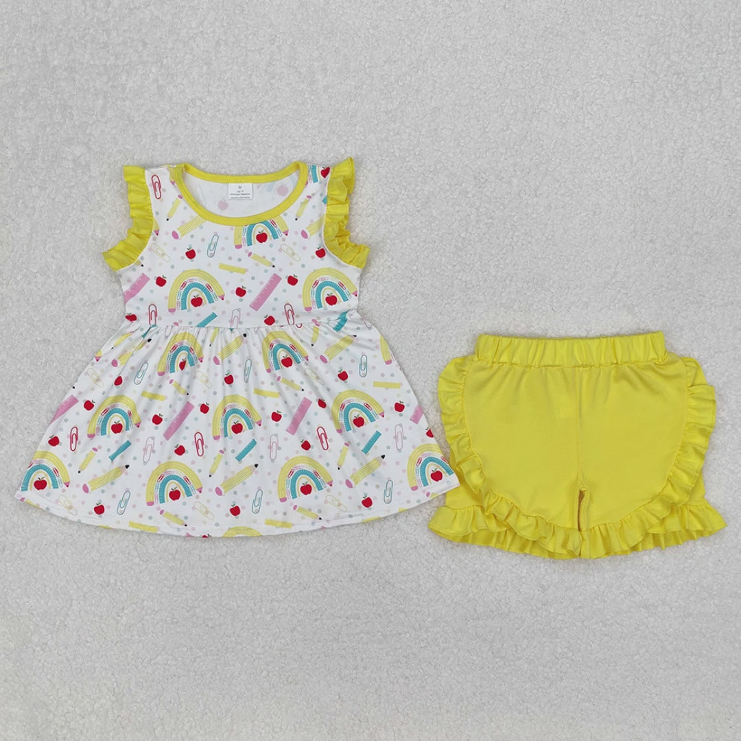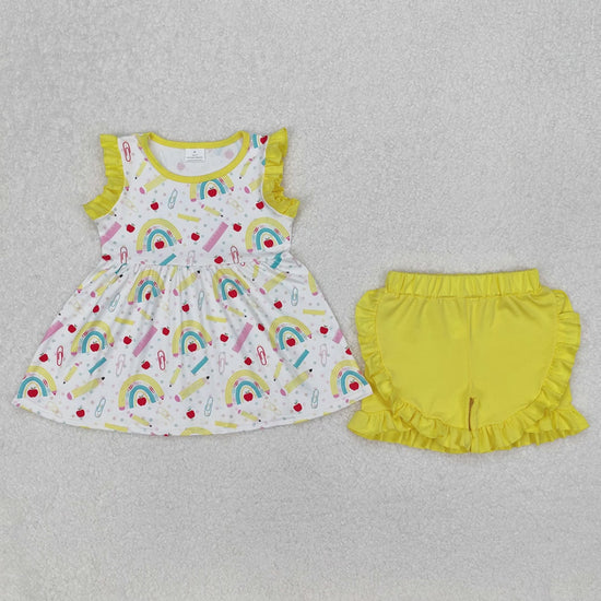 GSSO1913Girls Rainbow Pencil Skirt Outfit Yellow Apple Design Back to School Ensemble for Kids