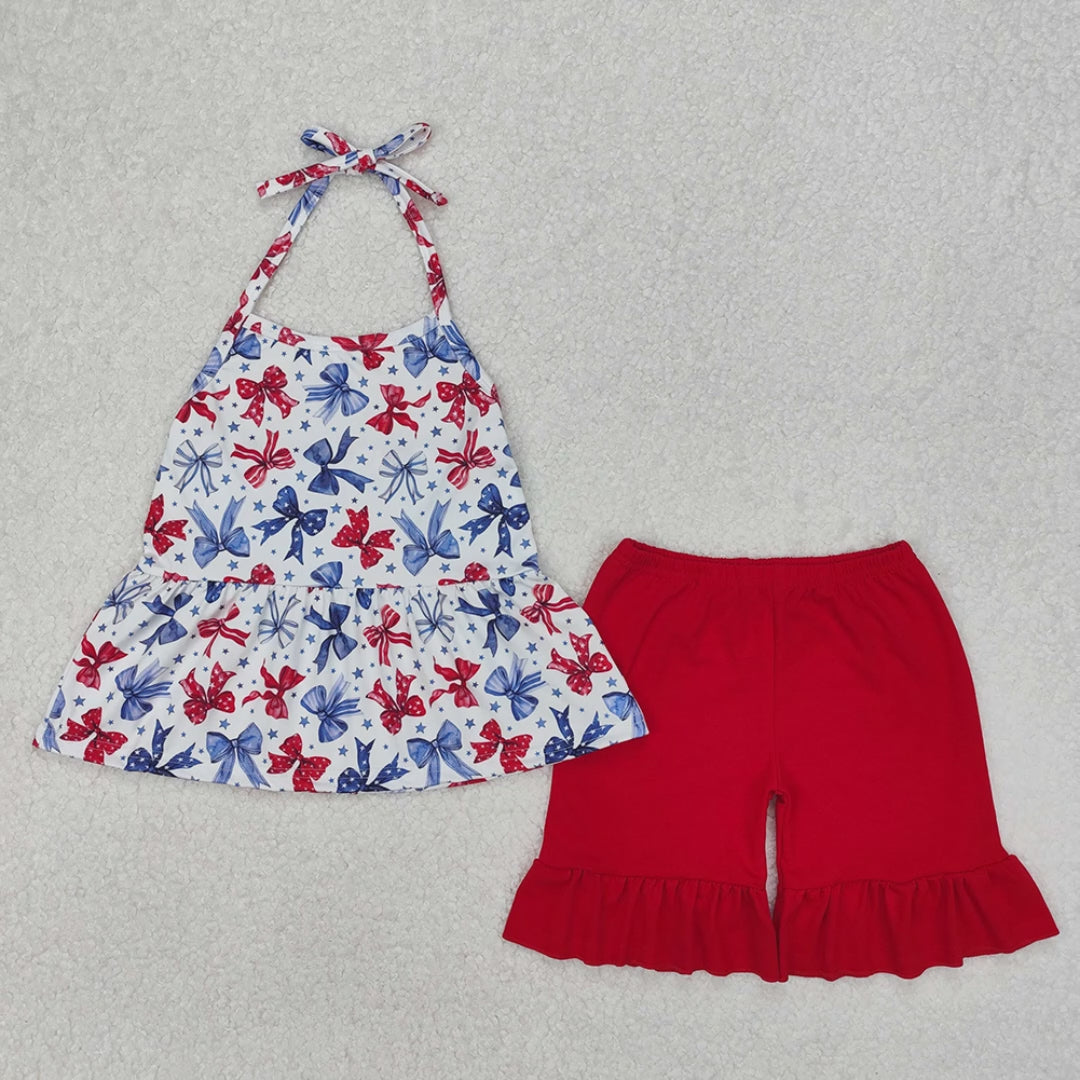 GSSO1928Girls Halter Top Shorts Set Stars Stripe Bow 4th of July Outfit Red White And Blue Patriotic Clothing for Kids