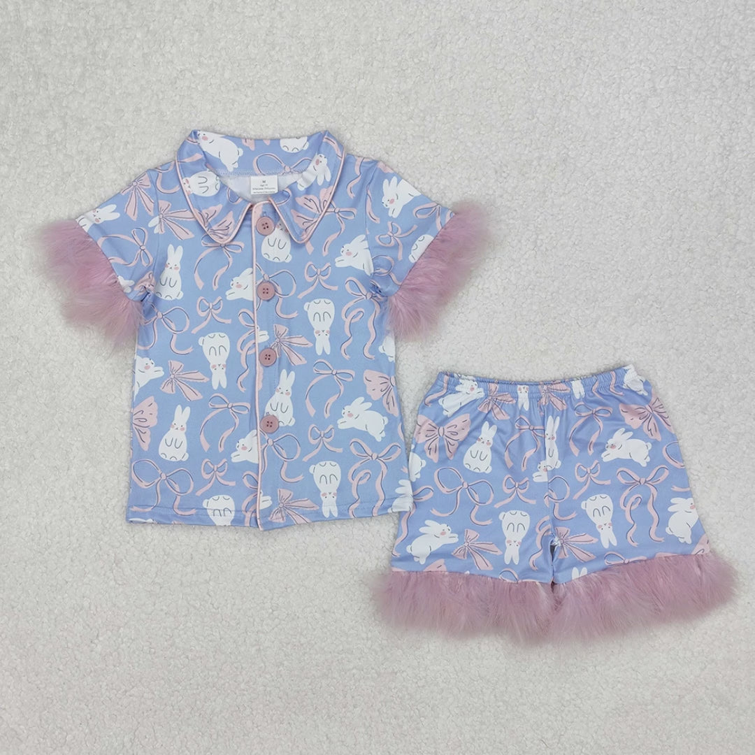 GSSO1946Baby Girls Easter Themed Bows Fur Print Shirt And Shorts Pajamas Set Cute Infant Clothing for Spring