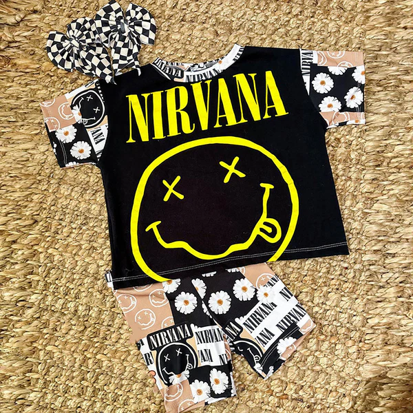 GSSO2241Cute Short-Sleeved Black Floral-Patterned Patchwork Garments for Girls