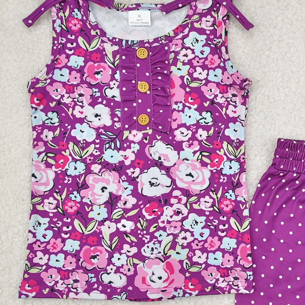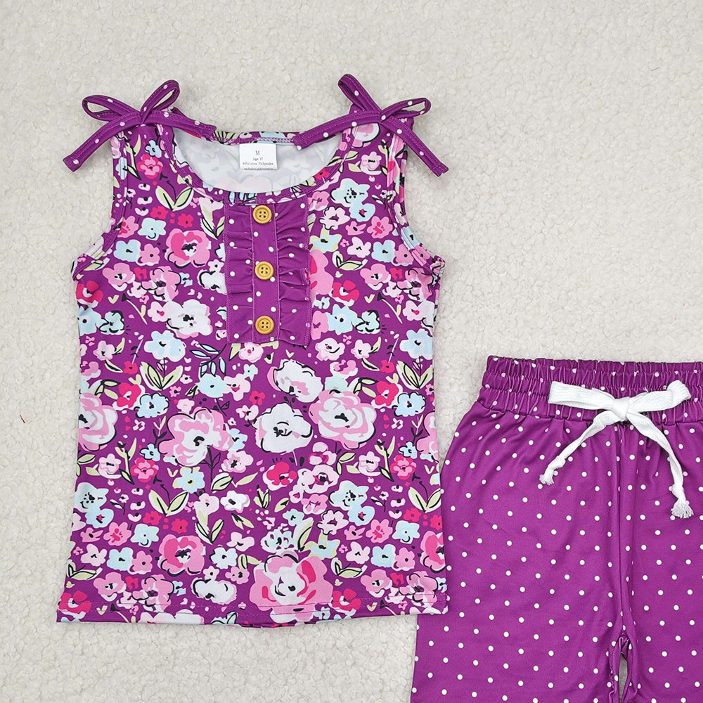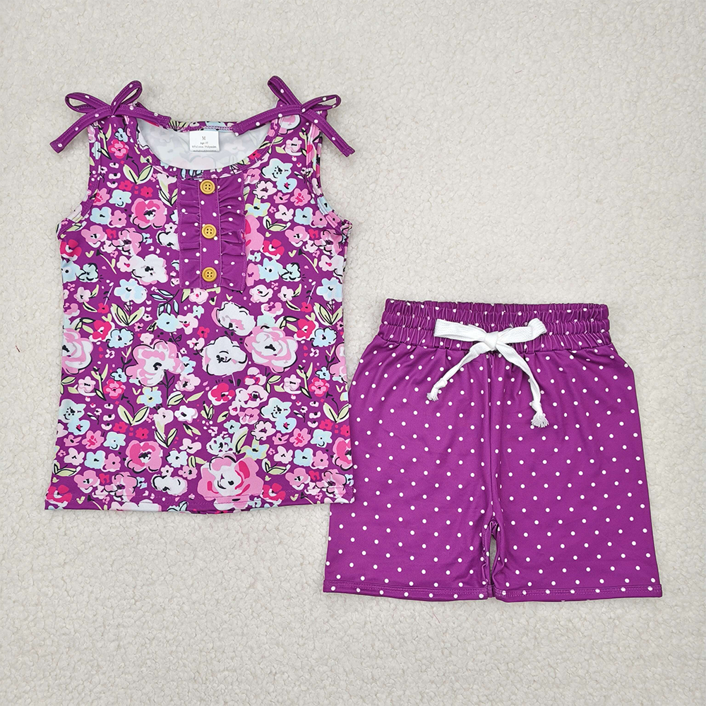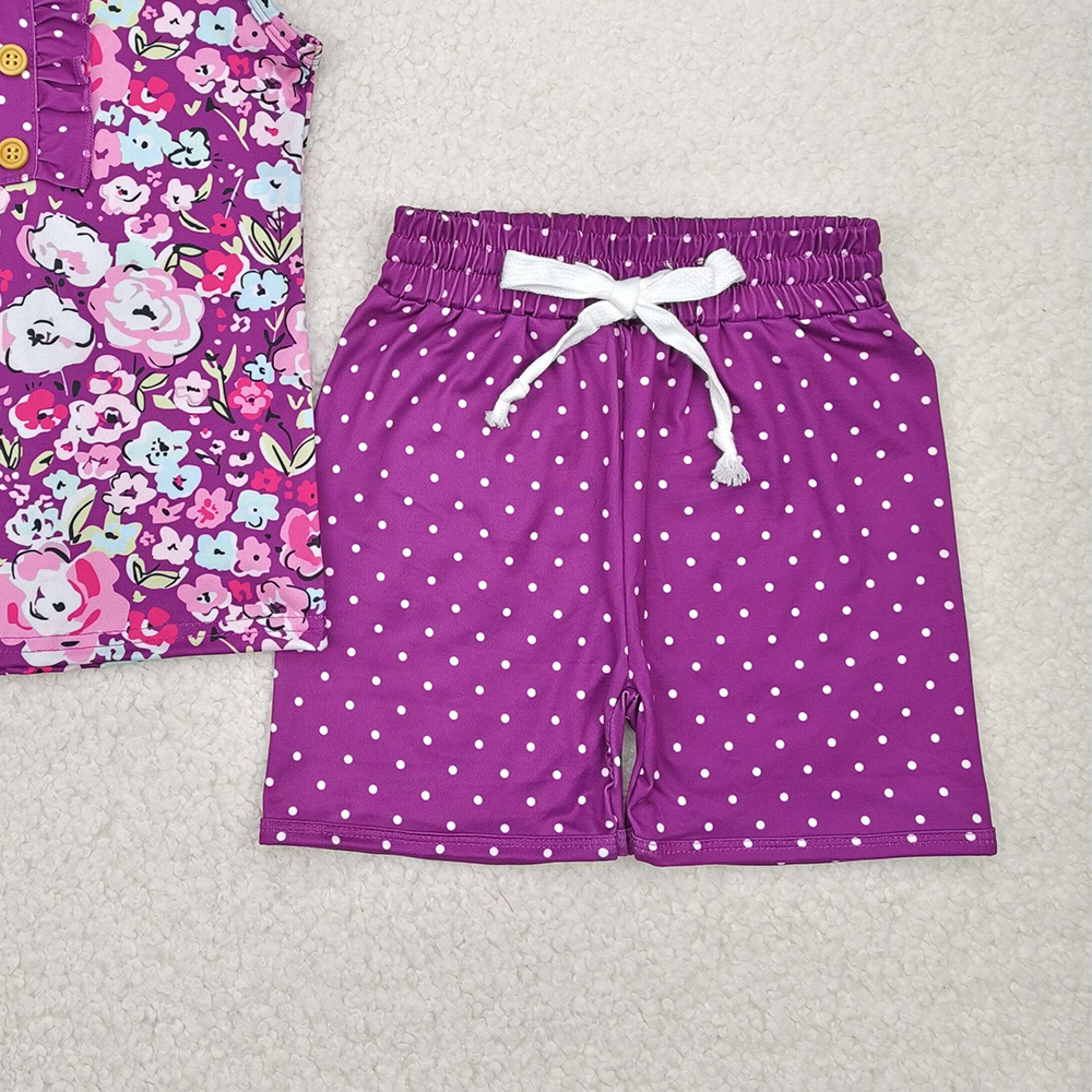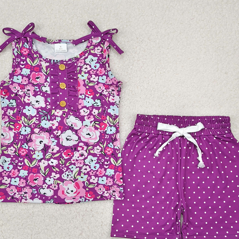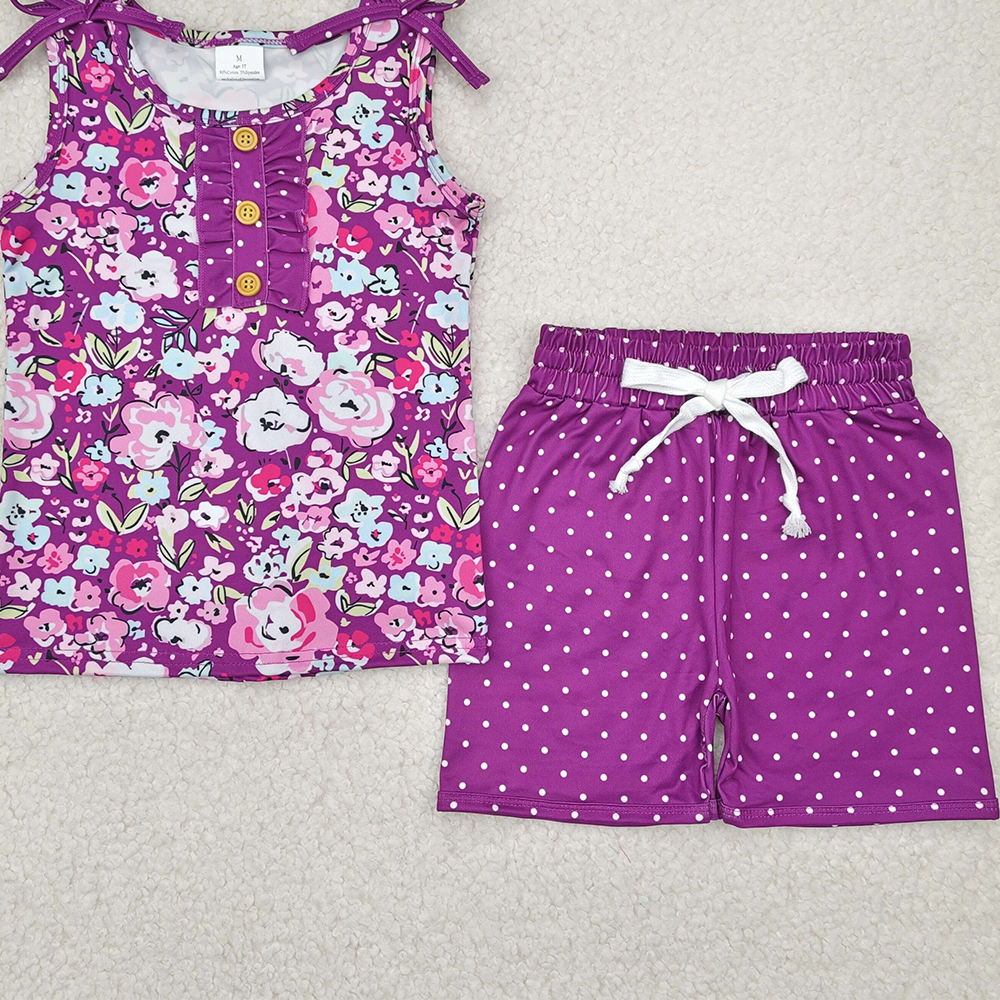 GSSO2358RTS NO MOQ Baby Girls Summer Outfits Girls Sleeveless Floral Top with Polka Dots Matching Shorts Outfit Set for Spring Summer