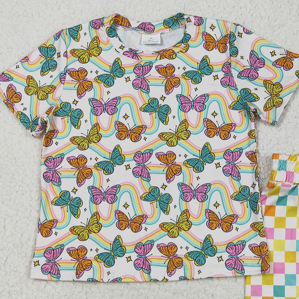 GSSO2615 RTS NO MOQ Baby Girls Summer Outfits Baby Girls Short Sleeves Butterfly Rainbows Top Colorful Plaid Short Pajamas Set