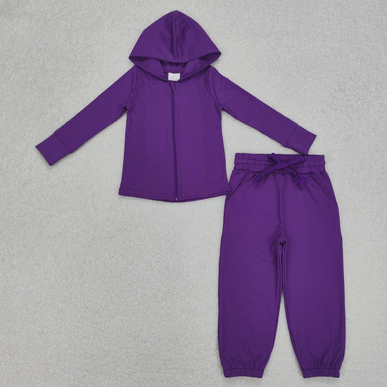 GT0807+P0670 New Rts No Moq 8-9 Days By Air Arrived it Girls Purple Hooded Zipper Long Sleeve Yoga Top with Matching Pants Set Comfortable Sportswear for Kids