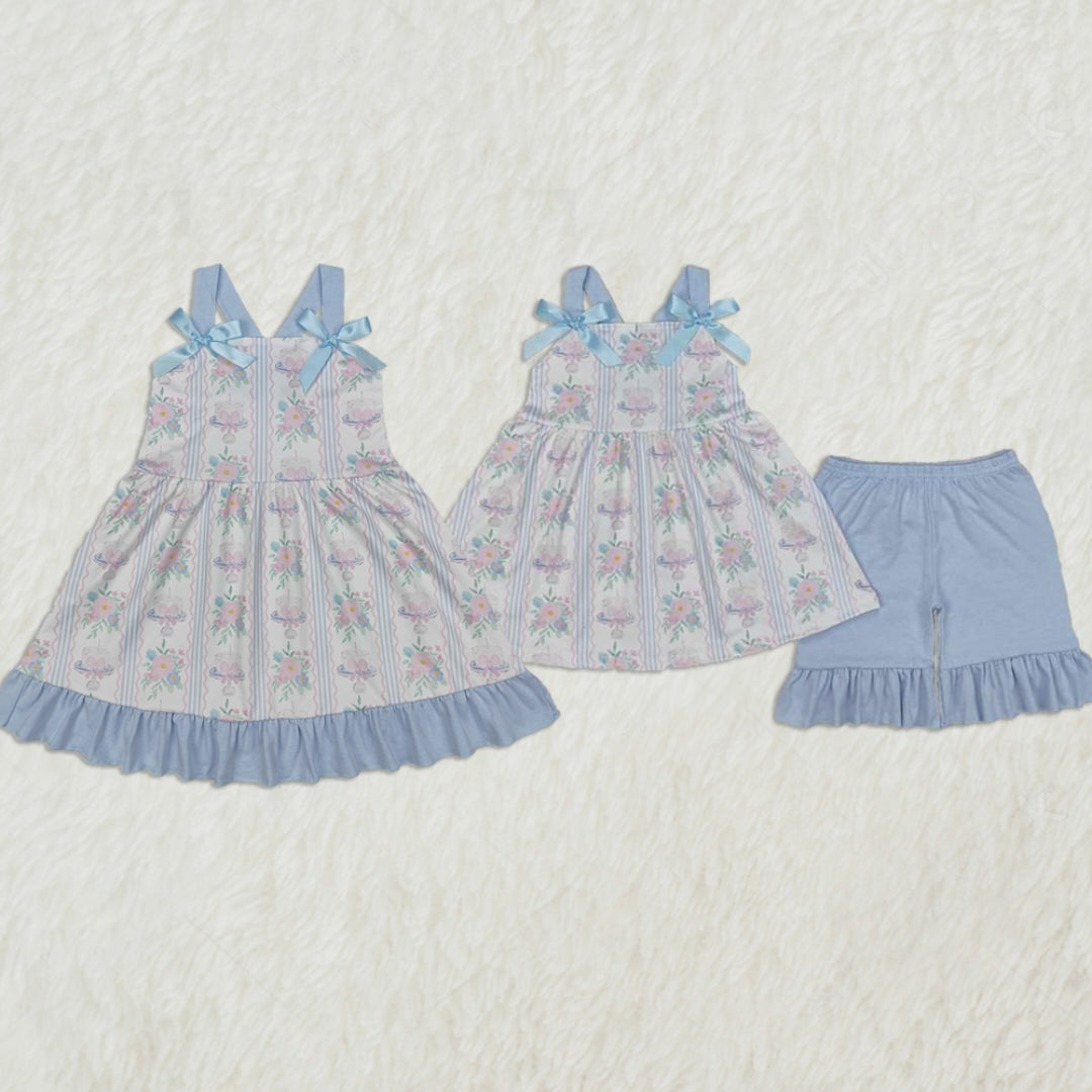 6.05 Light Blue Straps Floral Cake Bow Girls Birthday Clothes Cute Floral Design Strap Happy Birthday Girls Outfit