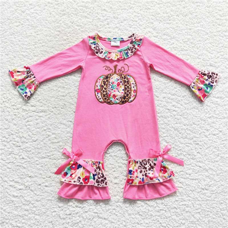 USA Shop (in stock)LR0511Floral leopard pumpkin ruffle baby fall romper