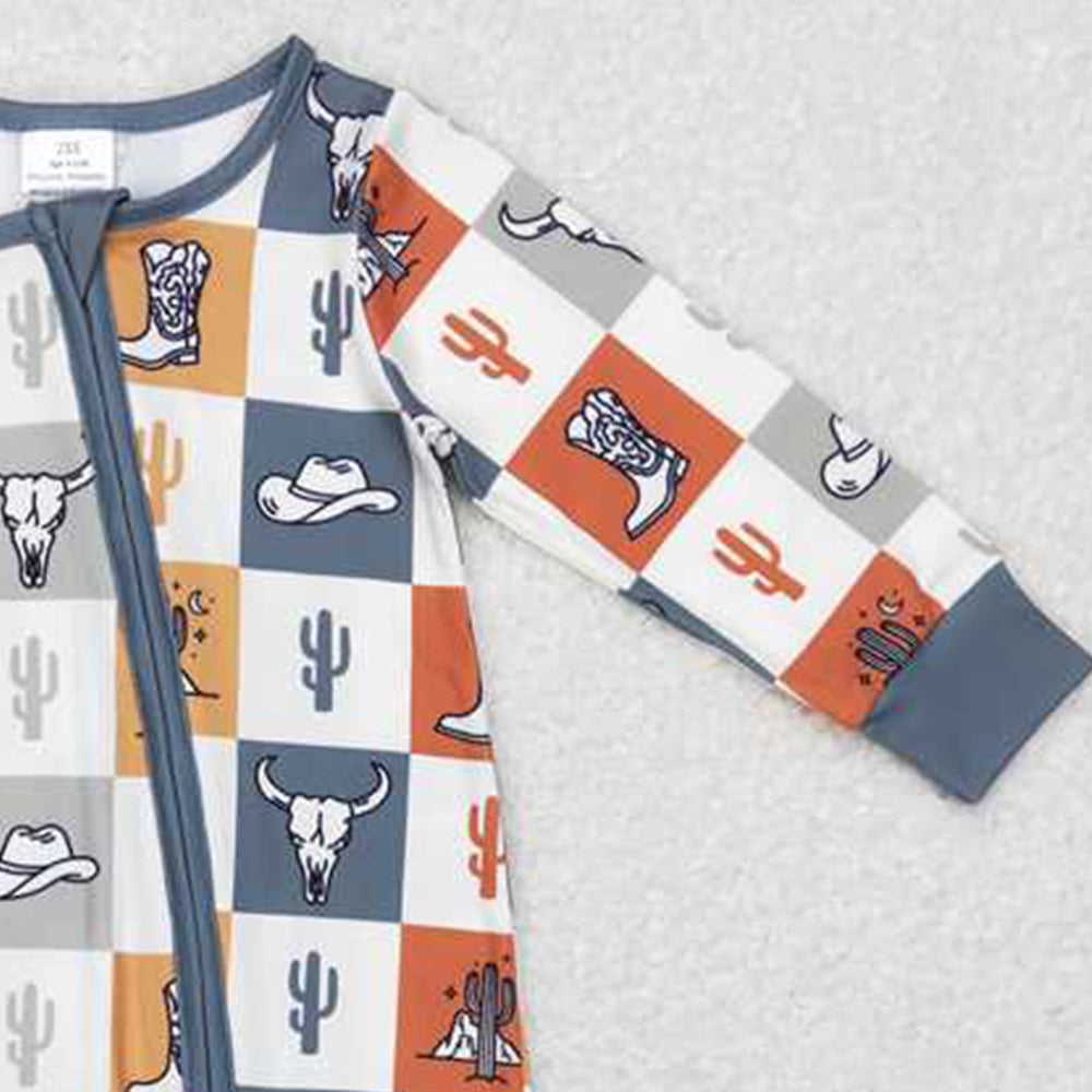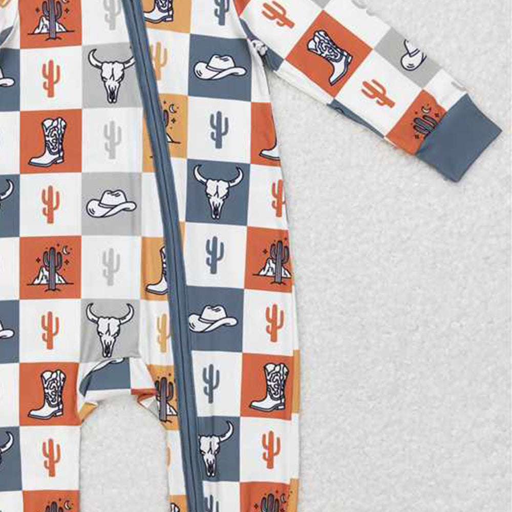 LR0803Plaid Baby Western Zipper Romper Bull Skull Cactus Boot Print Design Baby Boy Girl Rompers for Special Occasions