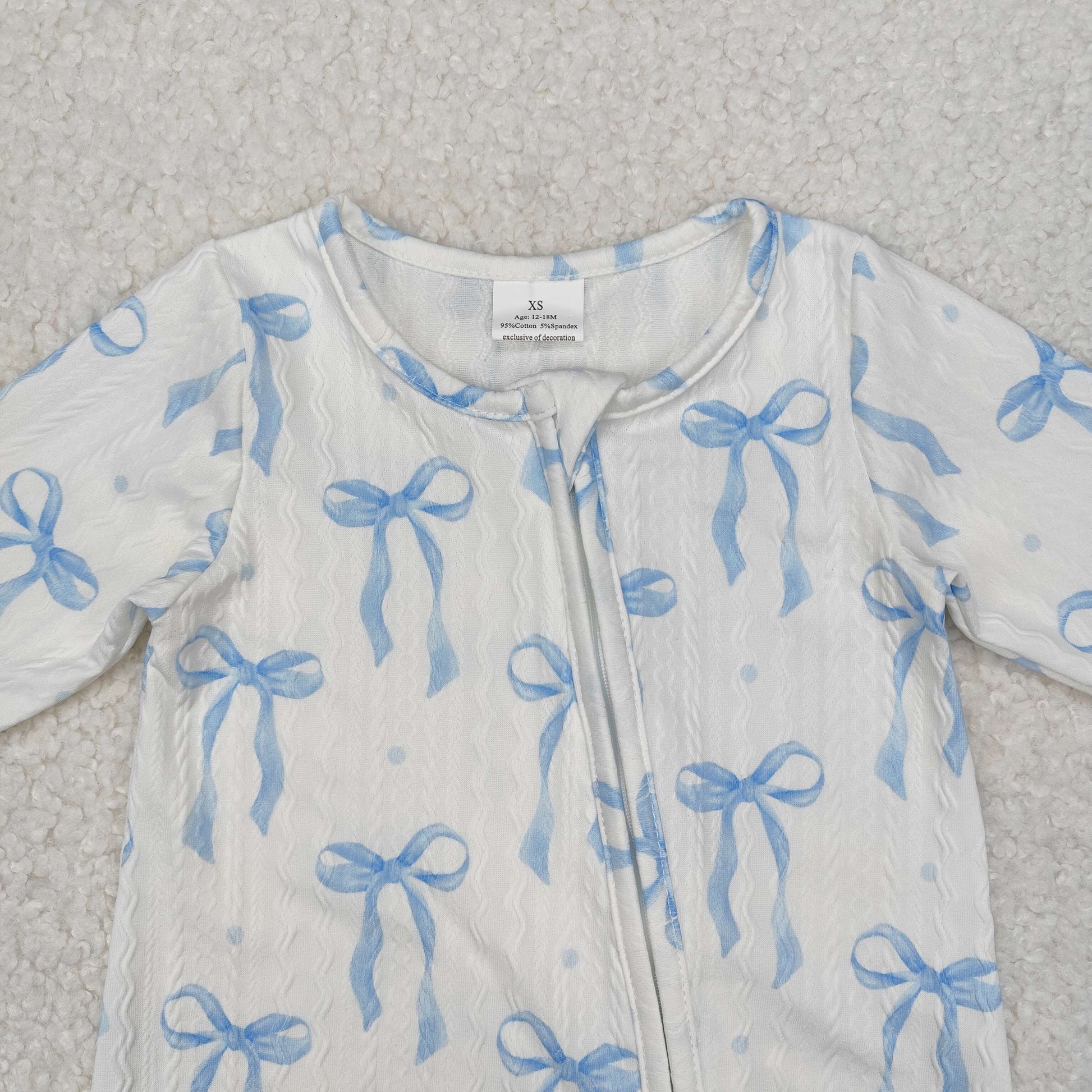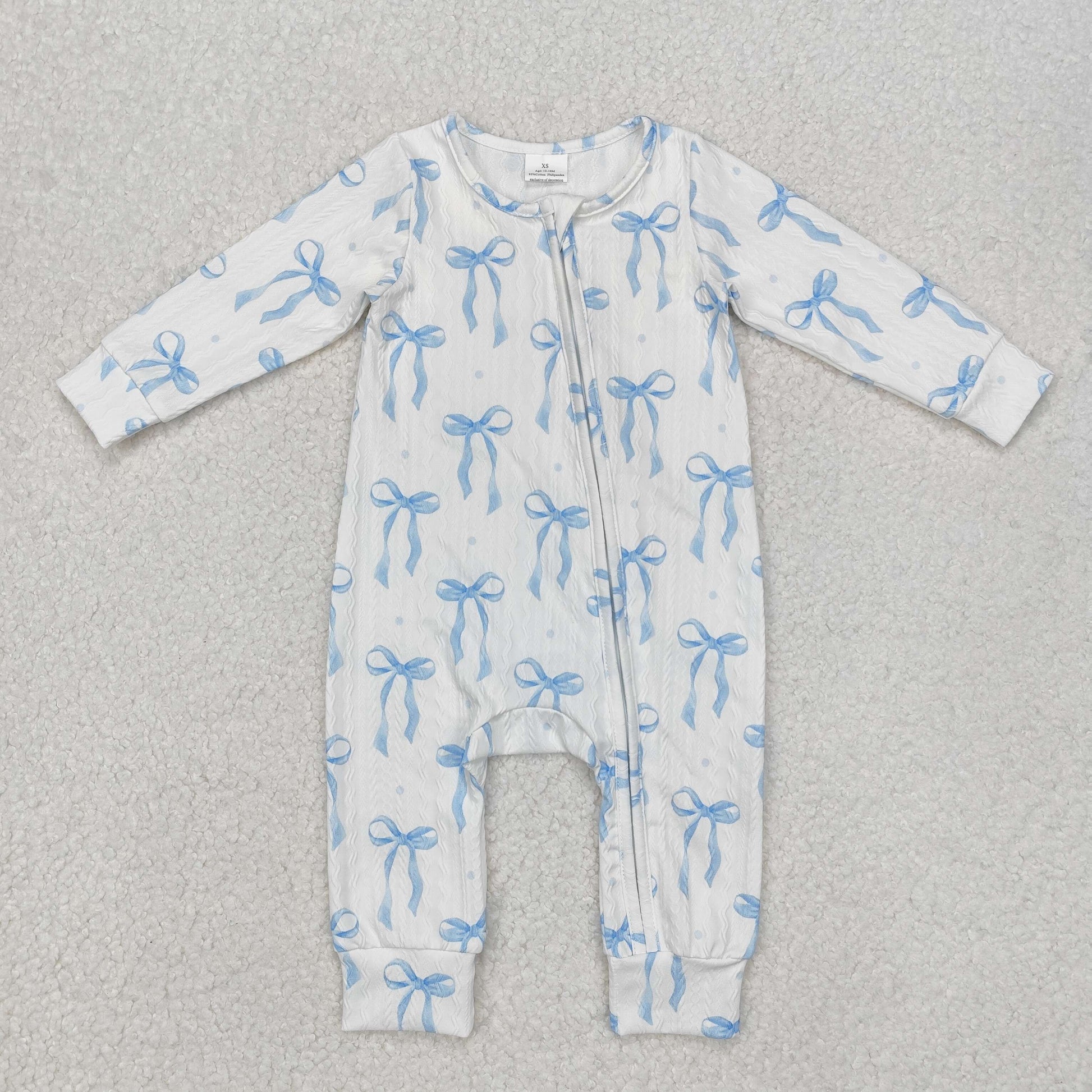 LR2070 Long sleeves light blue bow cable knit baby girl zipper romper