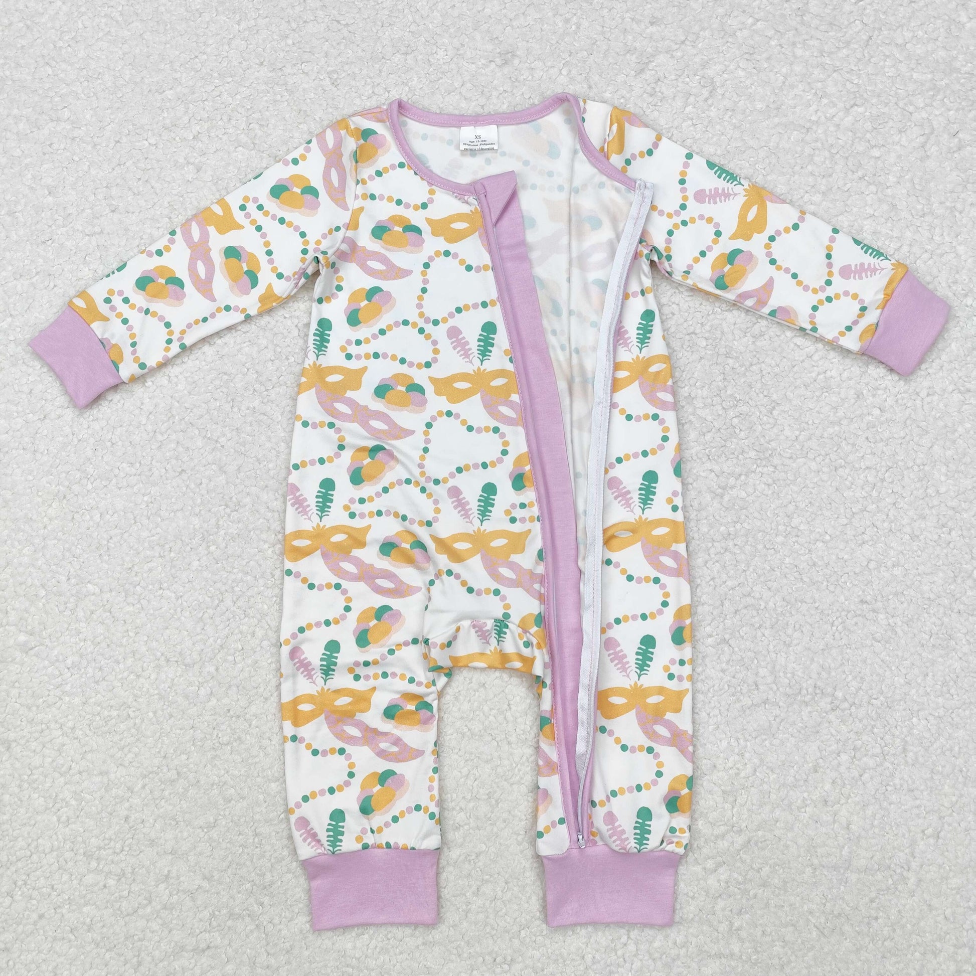 LR2097 Lavender baby girls mardi gras bamboo zipper romper