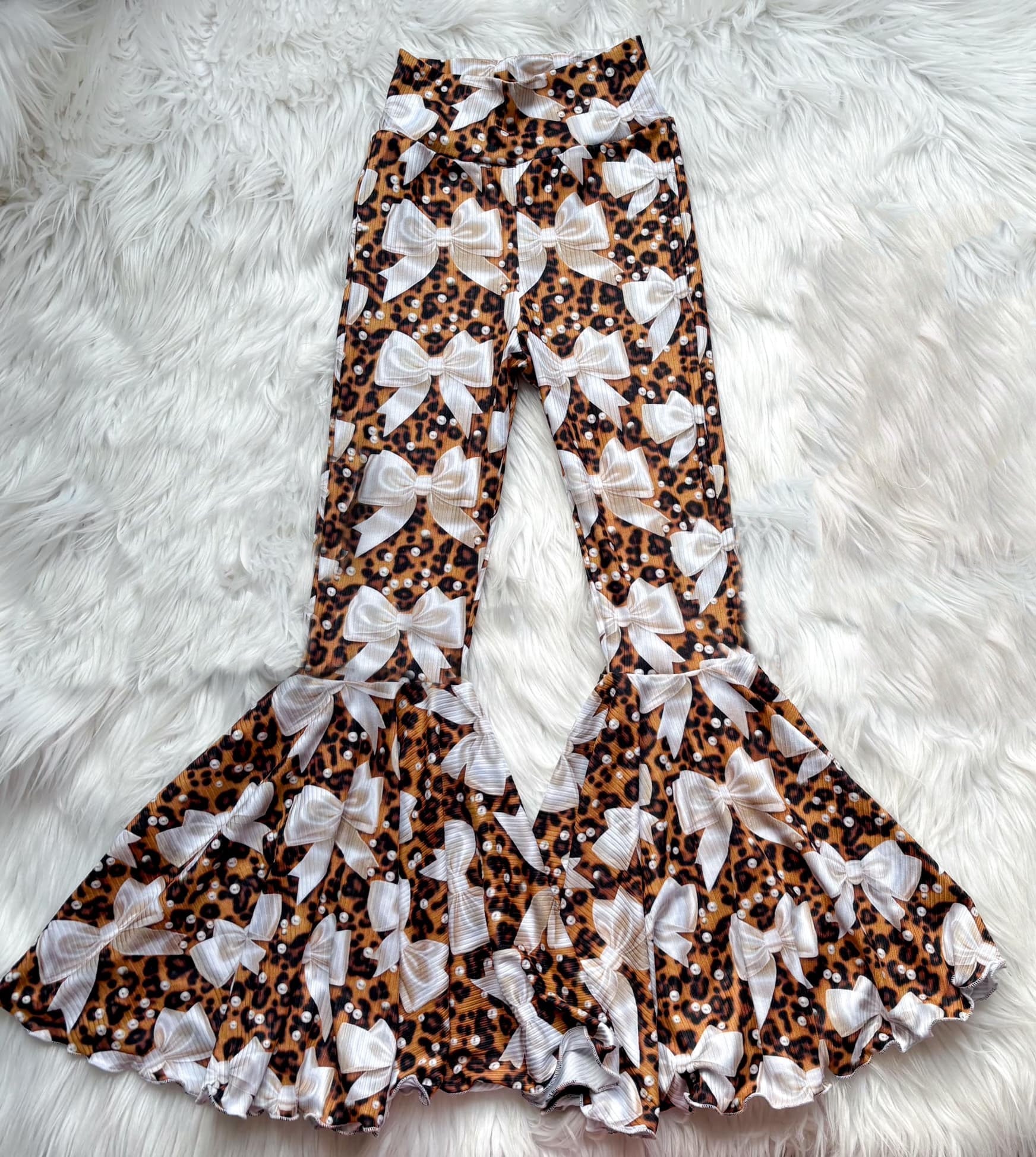 P0749Leopard Bow Bell Bottom Pants for Adult Women Fashionable Trousers with Bow Detailing