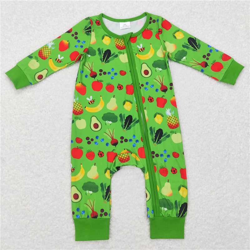 RTS LR0781 Green zipper long-sleeved jumpsuit with vegetable and fruit pattern